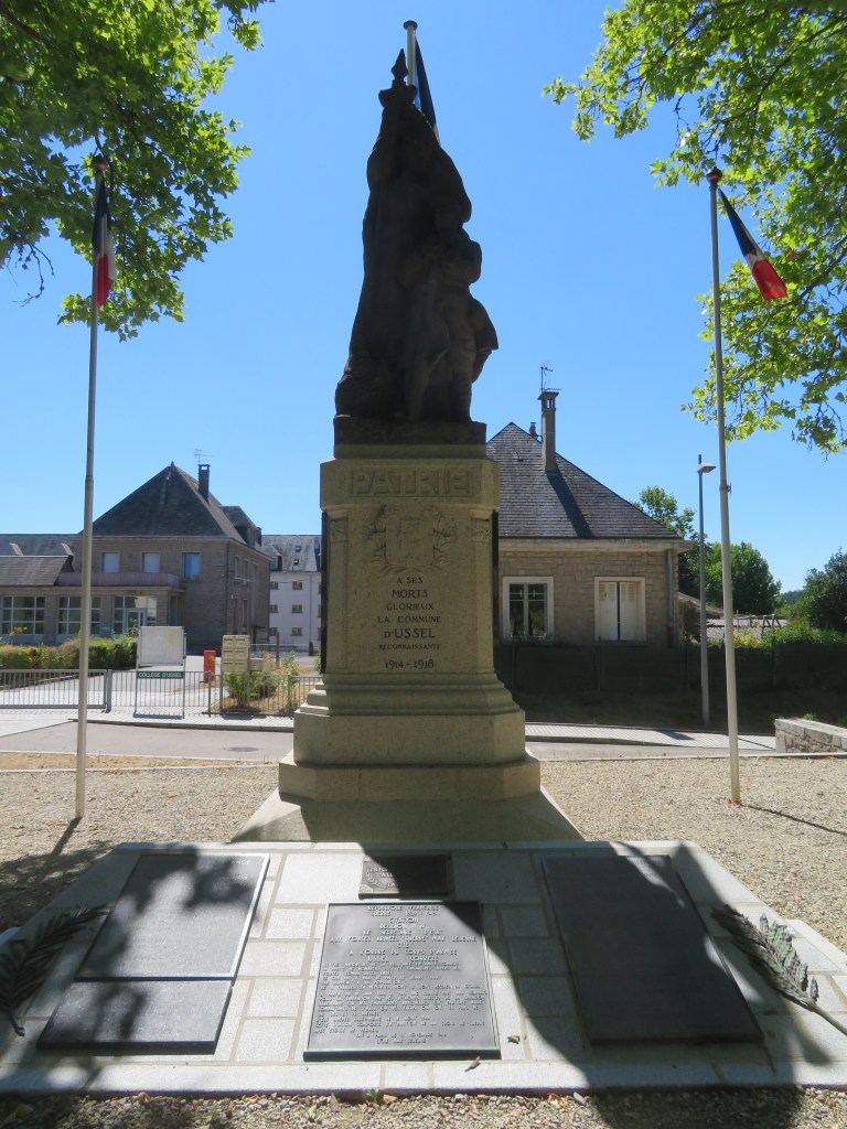C’est une copie en lave de Volvic du monument original inauguré en 1924 (sculpteur : Paul Graf), réinauguré donc en 2009. Une figure féminine monumentale protégeant et célébrant un poilu. Une sédimentation de plaques commémoratives qui rappelle la succession des guerres du XXe siècle. La Première, puis la Seconde, les combats de la Libération, les morts de la Fonderie Montupet, les Guerres de décolonisation. Raccourci d’un siècle : Ussel est la ville de naissance de Marcel Treich-Laplène (1860-1890) explorateur et colon dans la région de la future Côte d’Ivoire. Son buste, avec casque colonial, est dans le parc de la mairie d’Ussel. Son père Gustave, maire de la commune, a été magistrat en Kabylie, où est mort l’un des jeunes Ussellois dont le nom figure sur le monument.