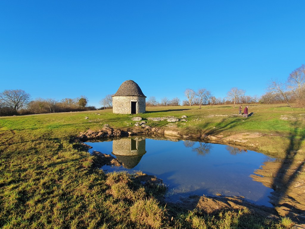 Pittoresque : la caselle du Lac Lacan à Livernon se reflète sur la surface du lac creusé pour les troupeaux en pacage.
