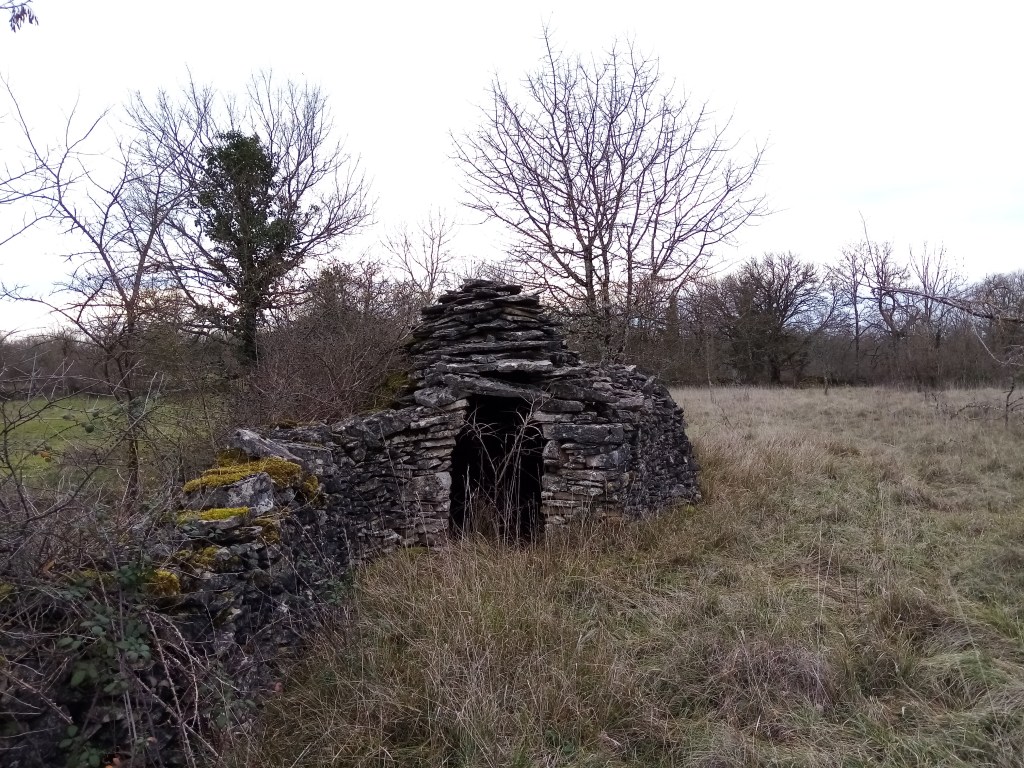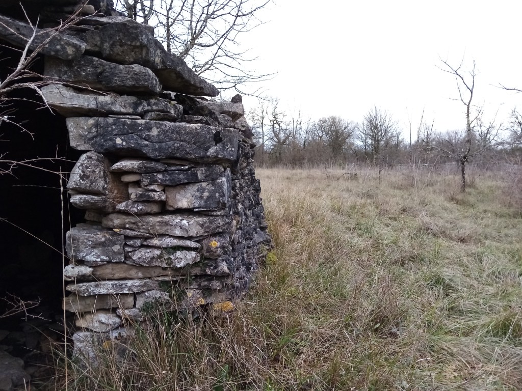 Aucun de ces abris n’est exactement le même que celui de la parcelle d’à côté. Cette gariotte prolonge un cayrou, là où le mur de clôture s’épaissit par apport de dalles et de divers blocs de calcaire remontés dans le sol à la fin de l’hiver. Cela fait longtemps que des animaux ou des humains ne se sont pas abrités dans cette gariotte. Le petit buisson à l’entrée et l’absence de marques de passage dans l’herbe sont les indices sûrs de ce délaissement. Les dalles disposées en une petite voûte commencent à s’affaisser, mais cela peut tenir encore longtemps.