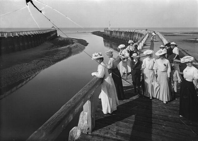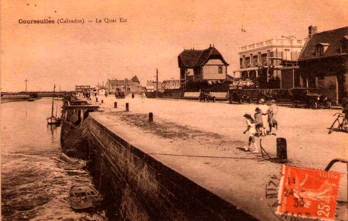 Plus loin, puisque c’est marée haute, on peut se promener sur la jetée, au-dessus de l’eau remuée, un peu verte. Evocation facile de pratiques contemporaines de la construction de la villa (ci-dessous : vue de la jetée vers Courseulles, la plage à gauche, le chenal d’entrée du port à droite. A droite : carte postale non datée, sur la jetée de Courseulles).