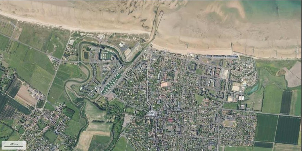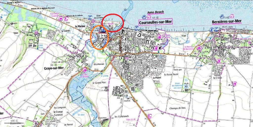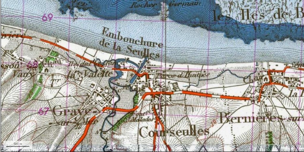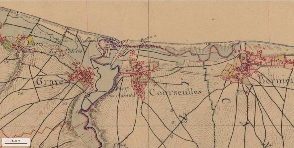 Et puis Courseulles a été comme toute la Côte, comme toutes les côtes, livrée aux voitures. Des programmes immobiliers à fonction touristique se sont développés sur la rive droite de la Seulles, juste en arrière de la plage. La villa avait été construite près du port, à distance du bourg de Courseulles, comme on peut le voir sur la carte d’état-major.