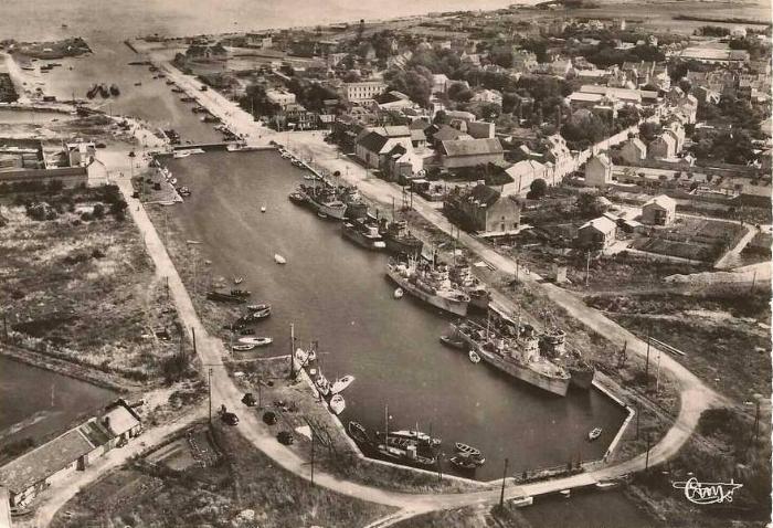 Les armées alliées ont débarqué le 6 juin 1944 sur la presqu’île juste en face. Evidemment, la villa était déjà là, comme sur ces cartes postales des années 1930, donnant directement sur les quais. On la voit aussi plus tard, alors que le port abrite encore quelques bâtiments militaires. Elle n’est pas coupée du port par la route et les parkings.