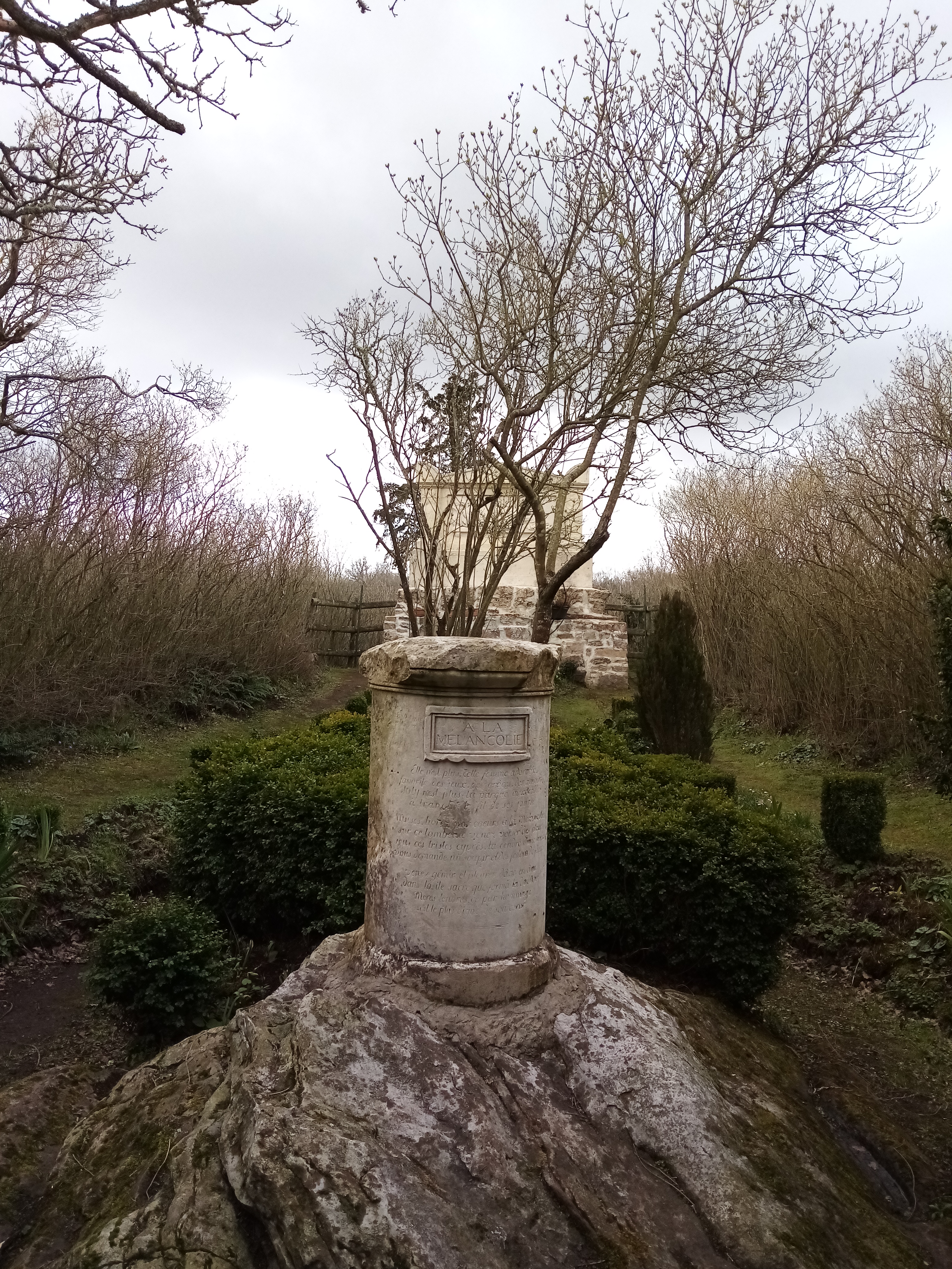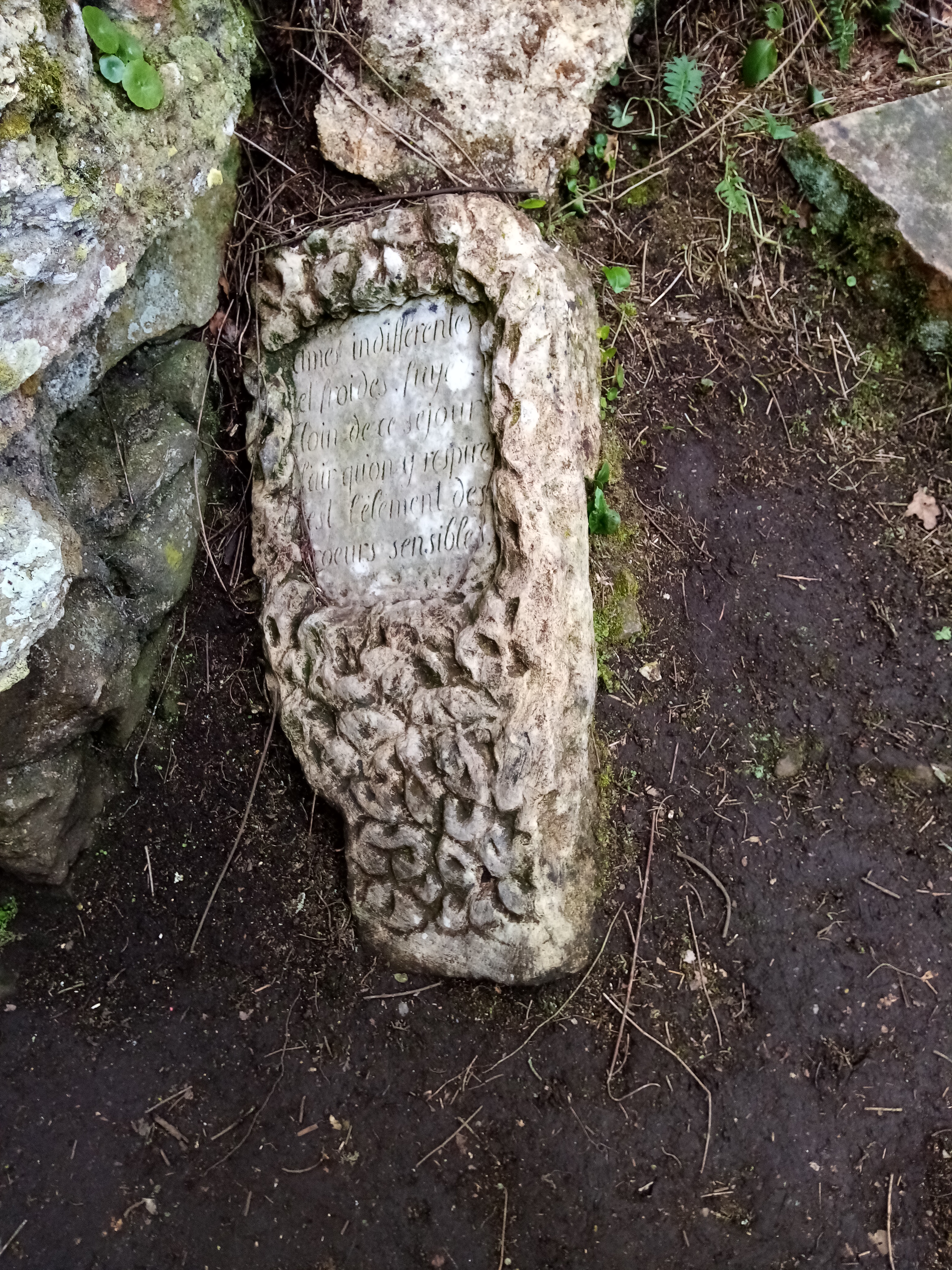 Des messages gravés sur les pierres disposées dans l’enclos font parler ce morceau de nature : la colonne placée face au portail d’entrée : A la mélancolie ; des sentences ici et là, par exemple : Ames indifférentes et froides, fuyez loin de ce séjour, l’air qu’on y respire est l’élément des cœurs sensibles (voir photographies ci-dessous).