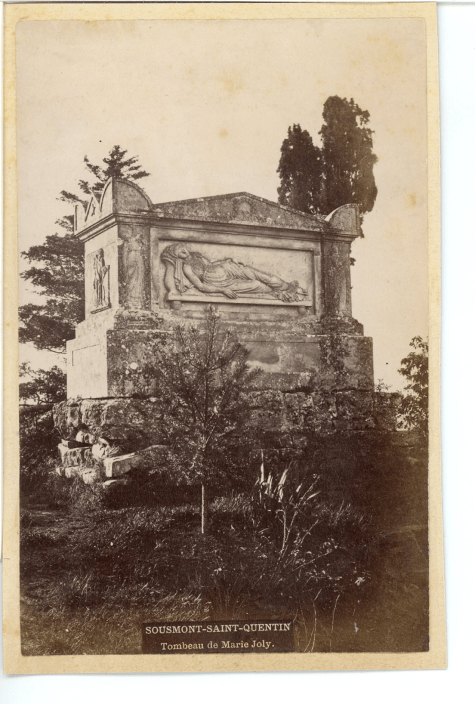 Dans l’enclos, un ensemble d’inscriptions nous accueille, un monde de paroles tant on semble s’adresser à nous, promeneurs, témoins interpelés. Le tombeau est remarquablement sculpté : le mari en a commandé la réalisation à Jacques-Philippe Lesueur (1757-1830) également auteur du tombeau de Jean-Jacques Rousseau. Ce tombeau qui ressemble dans sa forme et ses proportions à celui de Marie Joly est situé dans les jardins d’Ermenonville, propriété du marquis René-Louis de Girardin (1735-1808) où celui-ci invente avec l’architecte-paysagiste Jean-Marie Morel une forme de jardin-paysage conçu « en poète et en peintre ».
