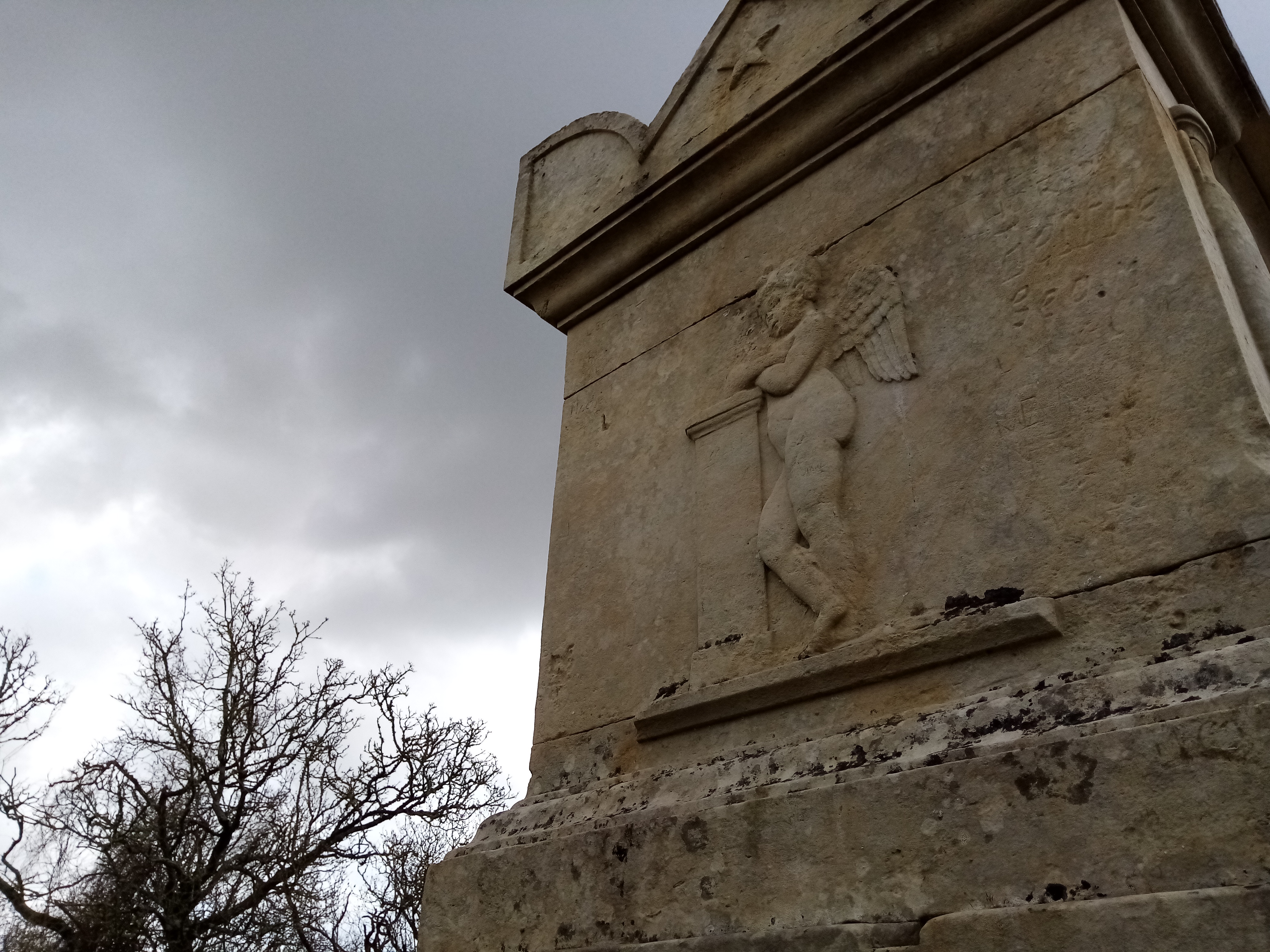 A plus petite échelle, quand nous entrons dans l’enclos, c’est aussi ce sentiment d’élévation qui domine. Le tombeau a été disposé sur un socle maçonné (il vient d’être restauré), ce socle étant lui-même édifié sur un léger ressaut du sol. Il ne s’agit pas là tant de surplomber le vide que de suggérer une ascension perpétuelle (voir première photographie).