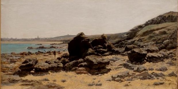 Elle précède nos existences de ses images : les affiches de chemins de fer, les tableaux de peintres paysagistes (Léon Hamonet 1877-1973 qui résidait à Erquy, mais aussi, de passage : Jean Francis Auburtin 1866-1930 ou Henri-Louis Saintin 1846-1899), objets du tourisme de masse… (ci dessous de haut en bas : L’anse d’Erquy – Saintin, 1876 ; Erquy soleil couchant sur la baie – Auburtin et deux aquarelles de Léon Hamonet).