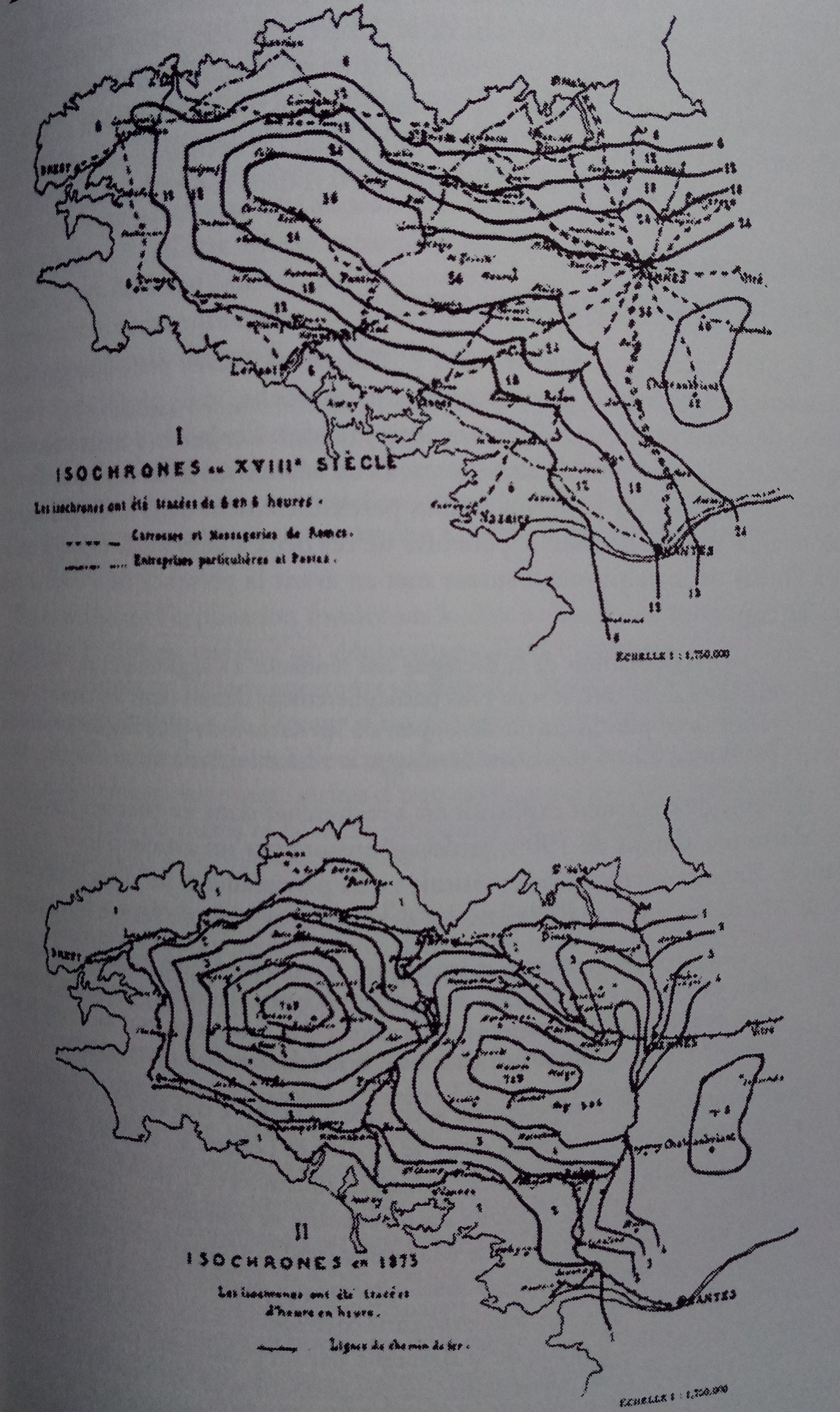 Certains discutent le déterminisme des conditions naturelles de la vie humaine et cherchent des effets intrinsèques de la distance – distance à la côté : Elie Robert, en 1905, une Carte de densité de la population car zones d’égal éloignement à la mer ; J. Lecatonnoux, en 1908 : cartes isochrones de la Bretagne. Source : Bernard Elissalde, 2001).