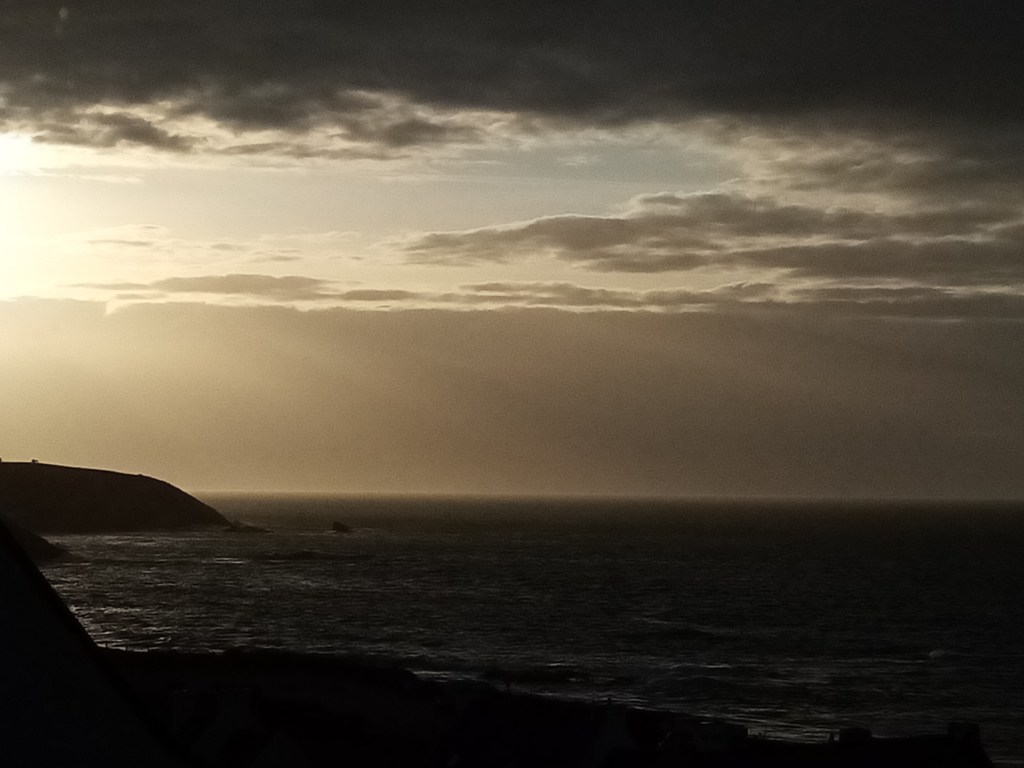 L’est, d’où nous arrivons, est barré par le cap Fréhel. On voit la chapelle Saint-Michel entre-deux ce matin.