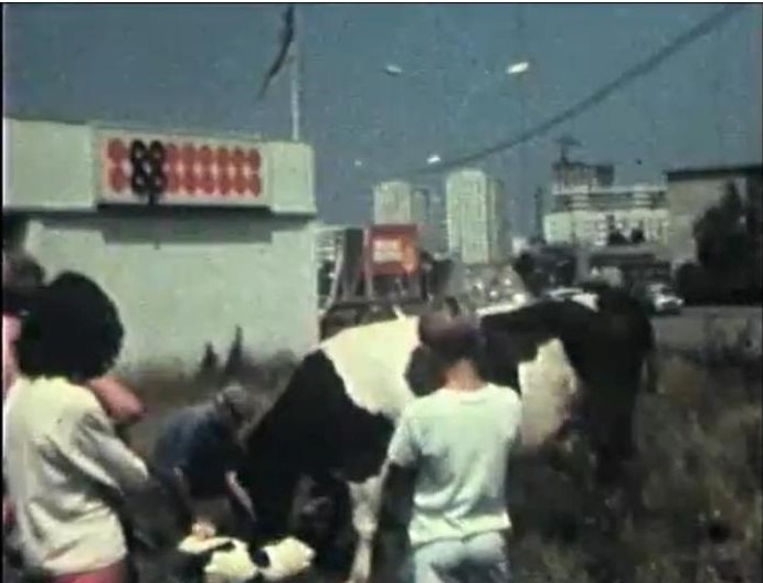 Ci-dessous : trois captures d’écran des films de Patrick Prado. Un vélage à Lorient en bordure de ville ; le paysan repart avec le veau dans le coffre de la 2CV tandis qu’un autre repart à pied avec la vache ; Anjela Duval en 1972. Une capture d’écran de l’entretien filmé en 1971 avec André Voisin.