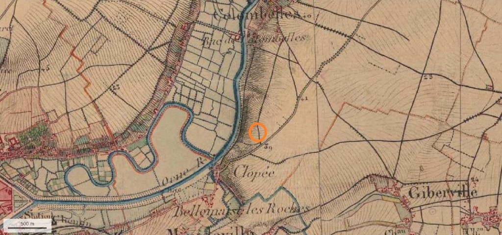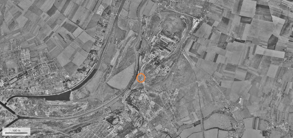 Ci-dessous : sur la carte d’état-major, juste le hameau de Clopée, pas encore de canal de Caen à la mer. Sur la photographie aérienne (un peu avant 1960), l’usine bien sûr. En face, pas d’Hérouville, pas de CHU ; c’est le quartier de La Pierre Heuzé à Caen, de l’autre côté du périphérique qui n’est pas encore tracé que l’on voit marquer le sol. Aujourd’hui (mai 2020), le site de l’usine s’est vidé alors que le plateau en arrière s’est densifié en zones d’activités et pavillonnaires. De l’autre côté, le plateau est pleinement urbanisé. Le CHU est en restructuration jusqu’en 2026.