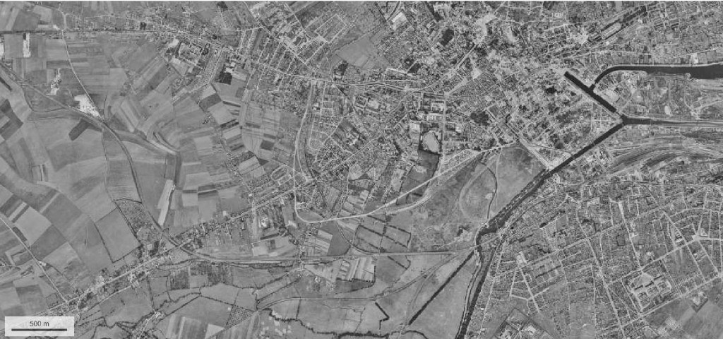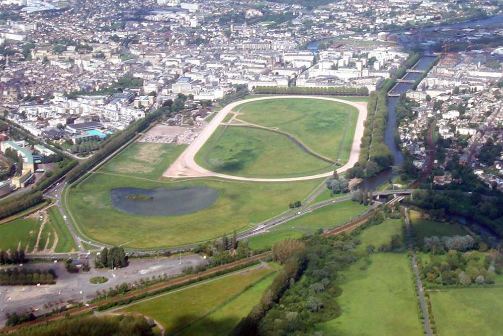 Voir ci-dessous photographie aérienne, années 1950. Le boulevard Guillou est visible, mais le viaduc de la Cavée n’est pas encore construit. Puis une carte réalisée par Armand Frémont (Atlas et géographie de la France, Flammarion, 1975). La Prairie signalée par l’hippodrome fait déjà figure de « poumon vert » dans une ville de l’automobile.