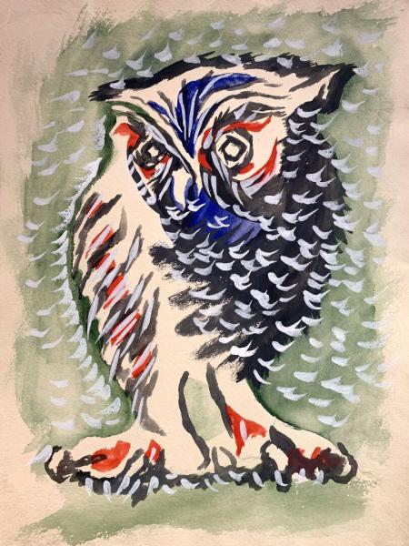 Aux silhouettes d’oiseaux fugaces de la série d’Ocello, succède un bestiaire, tempéré ou glorieux selon les moments, de coqs, d’insectes et de chouettes.
