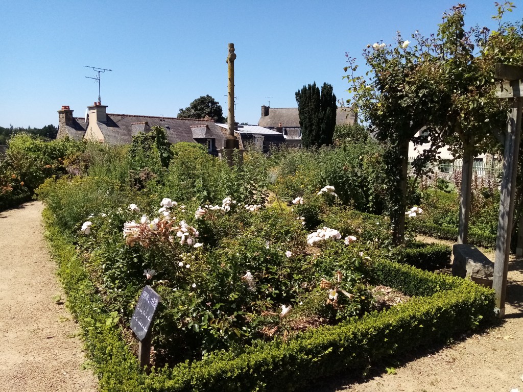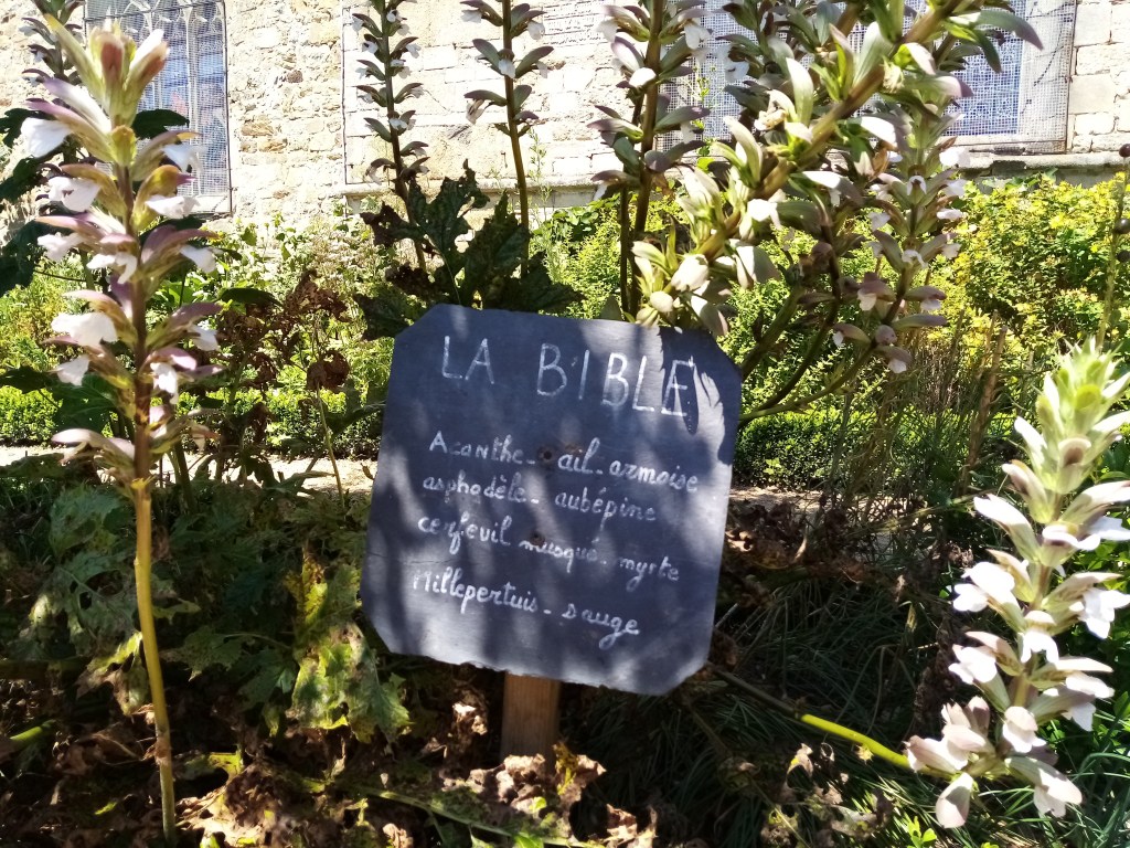 Un autre dispositif pour apprendre (ou ré-apprendre) : l’hortus et ses plantes et fleurs à manger – estragon, ciboulette, panais, sarrazin (c’est la première fois que j’en vois) ; le jardin des simples (plantes à soigner) ; le jardin de Marie (lieu de méditation, plantes à fleurir) avec des acanthes et de la lavande ; les plantes utilitaires, à l’origine de liqueurs (l’absinthe, quel parfum rien qu’à pincer une de ses feuilles ! ), de teintures (garance) ; « la Bible » : lieu de recueillement en hommage aux défunts (cerfeuil, aubépine, armoise).