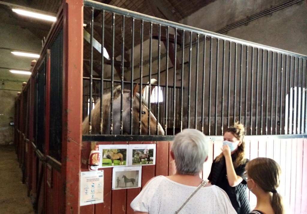 1° déjà nous : apprendre à reconnaître les races (Postier breton, Trait breton, aujourd’hui Cheval breton) avec l’aide de la guide et de cet étalon prêt à une démonstration (photographie ci-dessous) ;