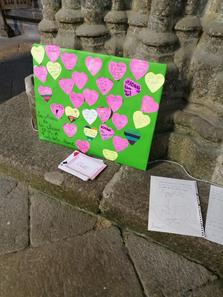 Au détour de la chapelle dédiée à Notre-Dame de Grande Puissance, un affichage de cœurs annotés, réalisés par les élèves d’une classe de CM2.