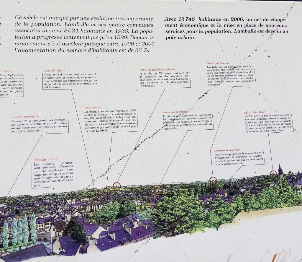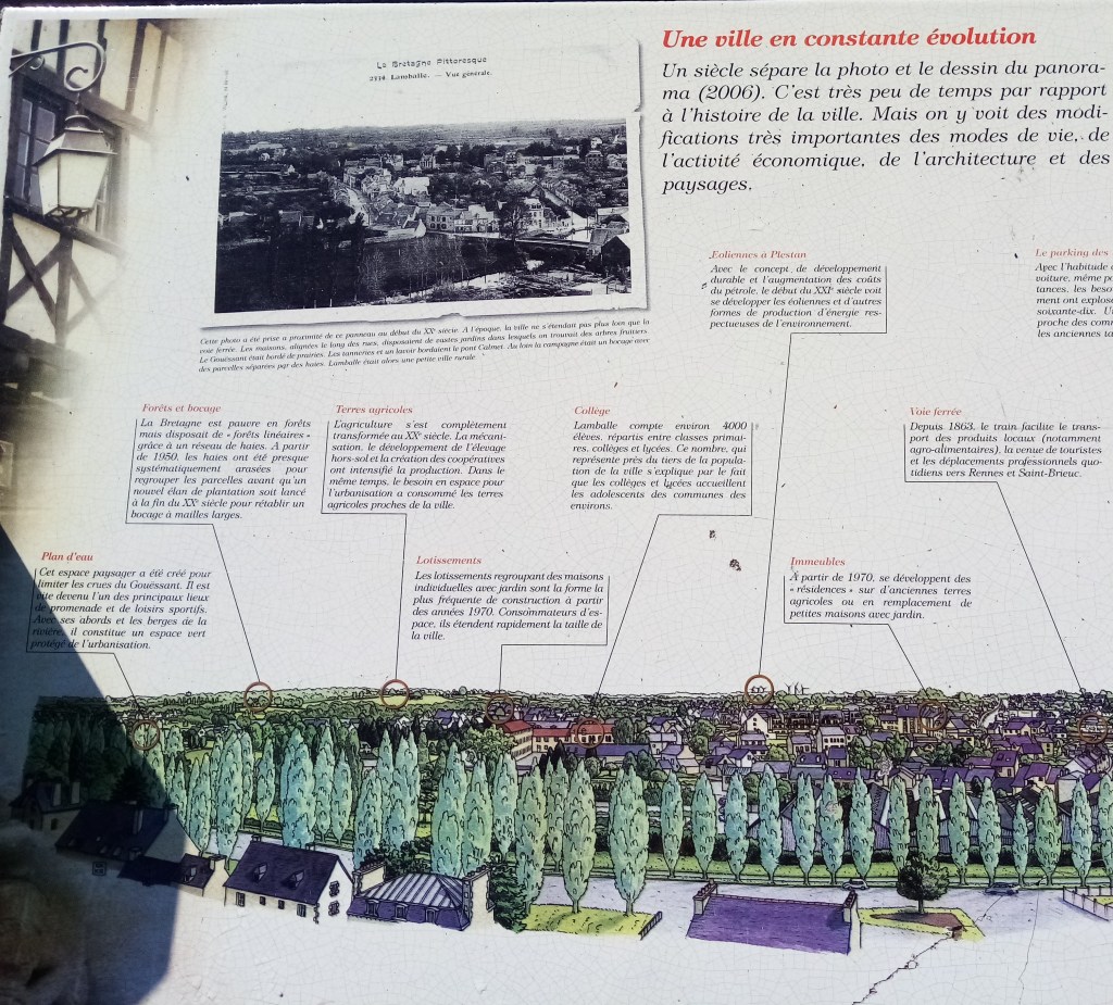 1. Devant l’abbatiale, reste de la forteresse des Ducs de Penthièvre, sur le parvis. Un dispositif de lecture paysagère. Pas vraiment une table d’orientation : la représentation ne présente pas une ligne d’horizon circulaire ou semi-circulaire, mais droite. Mais la table relève et commente un certain nombre d’éléments présents sous nos yeux, en contrebas, et plus loin dans des campagnes « moutonnantes » sans aspérité mais sans platitude non plus. L’intérêt de cette table est qu’elle n’oblitère ni les mutations spatiales et paysagères depuis les années 1960 (périurbanisation, industrialisation, patrimonialisation de l’ancien), ni les installations fonctionnelles et techniques récentes (éoliennes, etc.). Une production qui pour une fois ne sélectionne pas l’historique, la curiosité et les points « remarquables ». Une école de formation (géographique) du regard ;