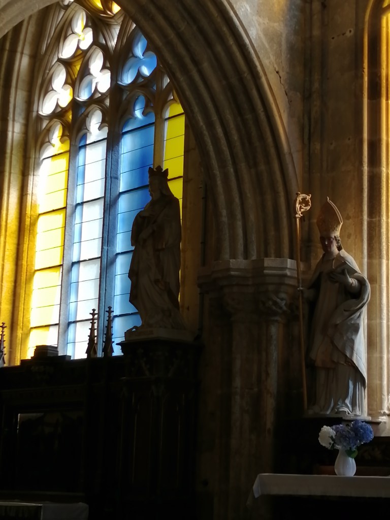 • 2. Dans l’abbatiale, des vitraux. Une pancarte lue quelques mètres avant nous avertit de la présence de vitraux de Geneviève Asse et Olivier Debré… Les vitraux sont conçus dès le Moyen-Age pour l’éducation religieuse des foules. Qu’enseignent ces vitraux contemporains ? A chacun sa leçon… On y apprend au moins à s’interroger sur la lumière tout en y plongeant. Cette lumière produite par les jaunes et les bleus, polis ou mats et faisant ressortir le grain du granite, la personne qui a disposé ce bouquet d’hortensias blancs et bleus la connaît (voir photographie ci-dessous).