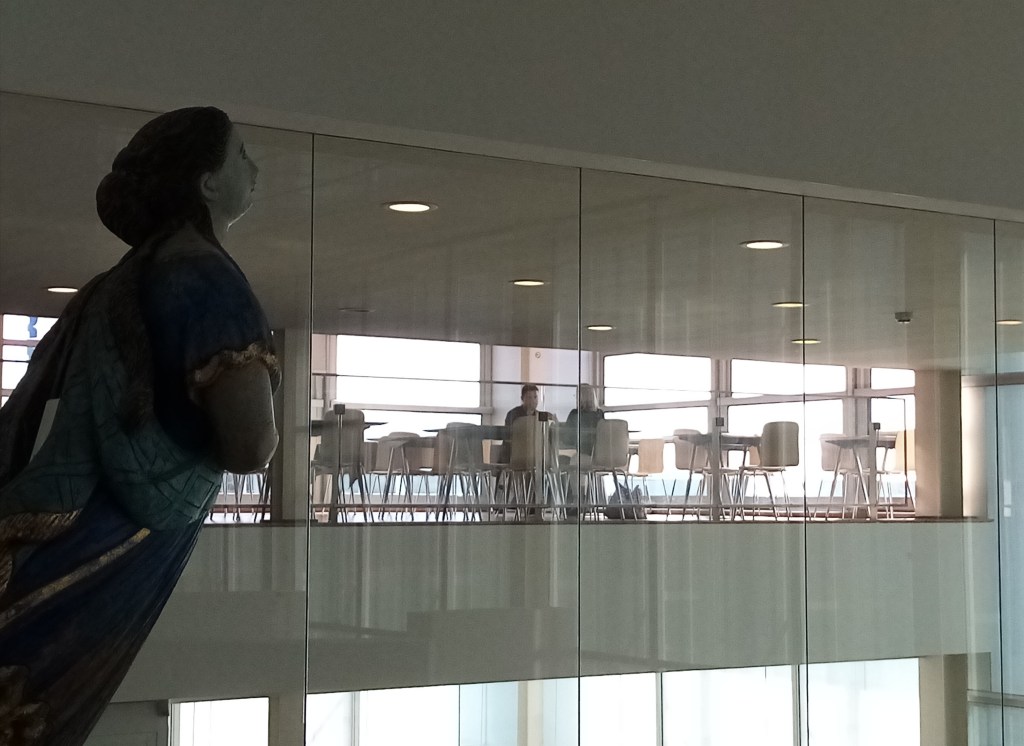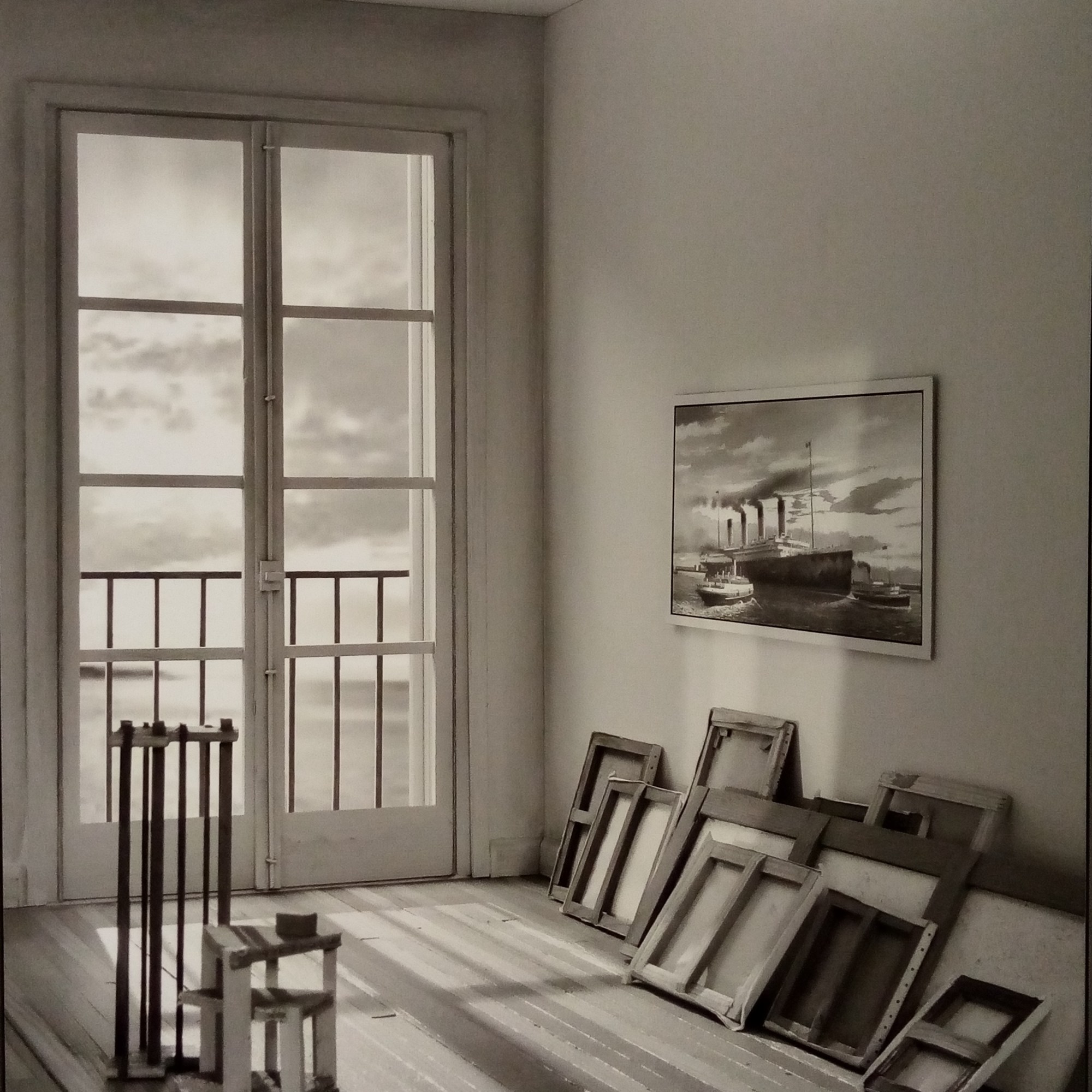 au MuMA à l’entrée dans l’espace d’exposition, la proue sculptée d’un navire haut placée. Elle est (à) l’image de ce musée tourné(e) vers le large. Regarder au-dehors depuis cet espace quasi-transparent, c’est s’appuyer sur les supports de cadrage offerts par la structure et les aménagements intérieurs du bâtiment. Je cadre… on voit des découpes dans la photographie… mais c’est la proue qui fait cadre. Elle dit : regarde, je suis le cadre… il y a eu cadrage. Regarde, c’est une photographie.