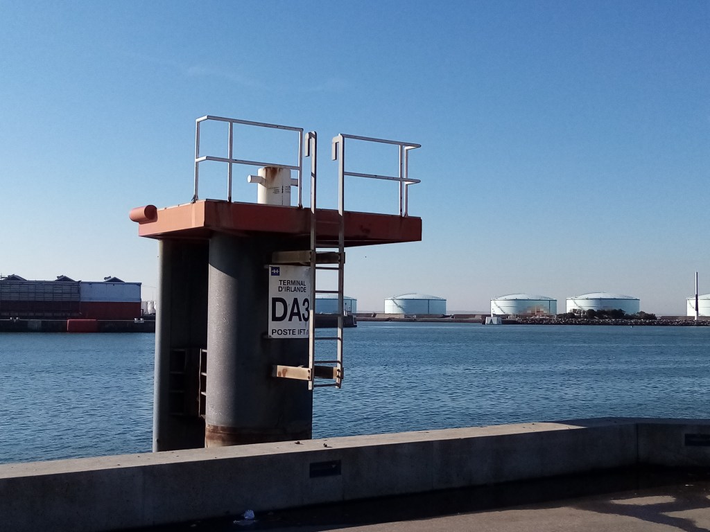 on peut chercher des amorces (des synecdoques) de cadre. Voici un équipement du terminal d’Irlande. Il fait un très bon coin de cadre pour un paysage d’avant-port ; à l’arrière-plan les réservoirs de kérosène dont Nicolas explique comment ils sont la marque visible de flux de d’échelle nationale et mondiale. Le cadre pour instiller le doute sur le sens du découpage qu’il propose. Dehors est aussi dedans et vice-versa. L’activité du Havre excède évidemment les bordures de ce cadre.