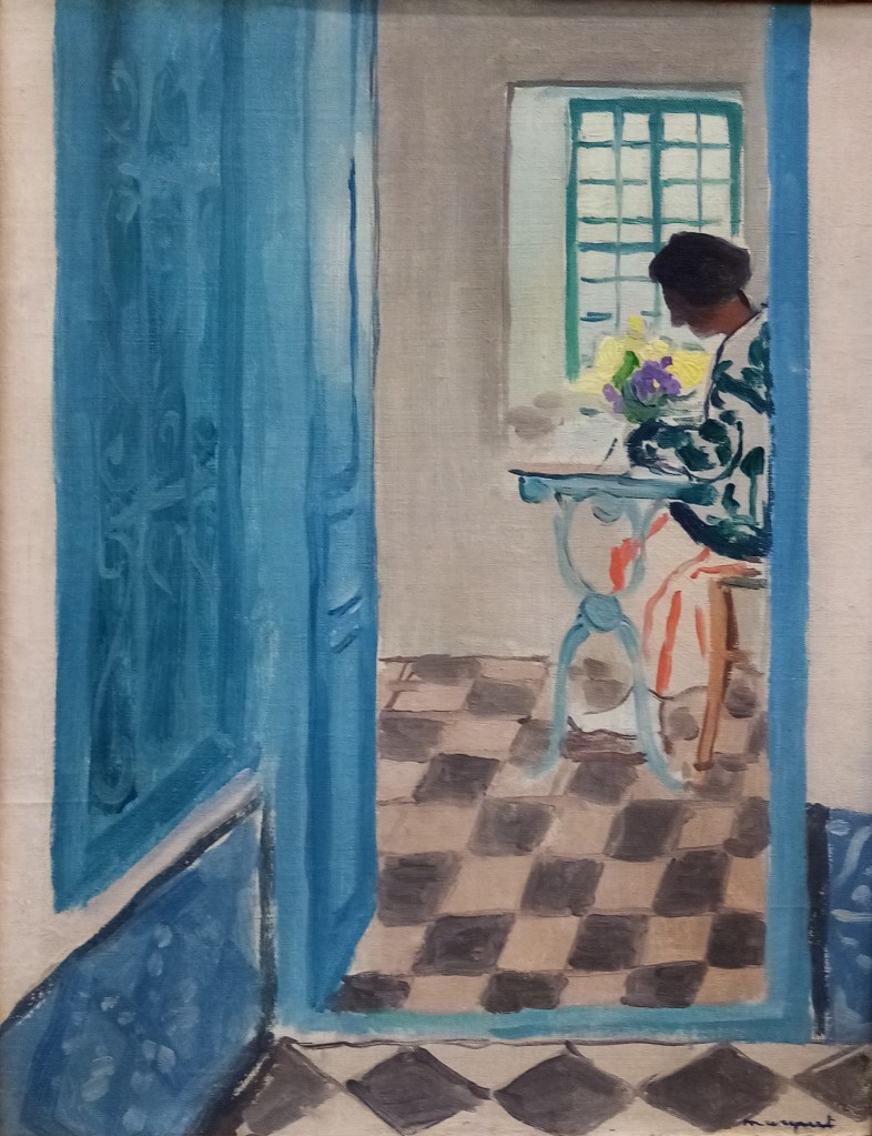 évidemment, chercher dans le musée des œuvres dont les auteurs jouent avec le cadre (le cadre dans le cadre, représenter l’acte de représenter) : la fenêtre, le balcon, la porte… : Albert Marquet (Balcon avenue de Versailles, 1904 ; Intérieur à Sidi Bou Saïd, 1923), Pierre Bonnard entre deux ci-dessous (Intérieur au balcon, 1919 : tiens la figure de Marthe en bas à droite fait aussi le cadre)
