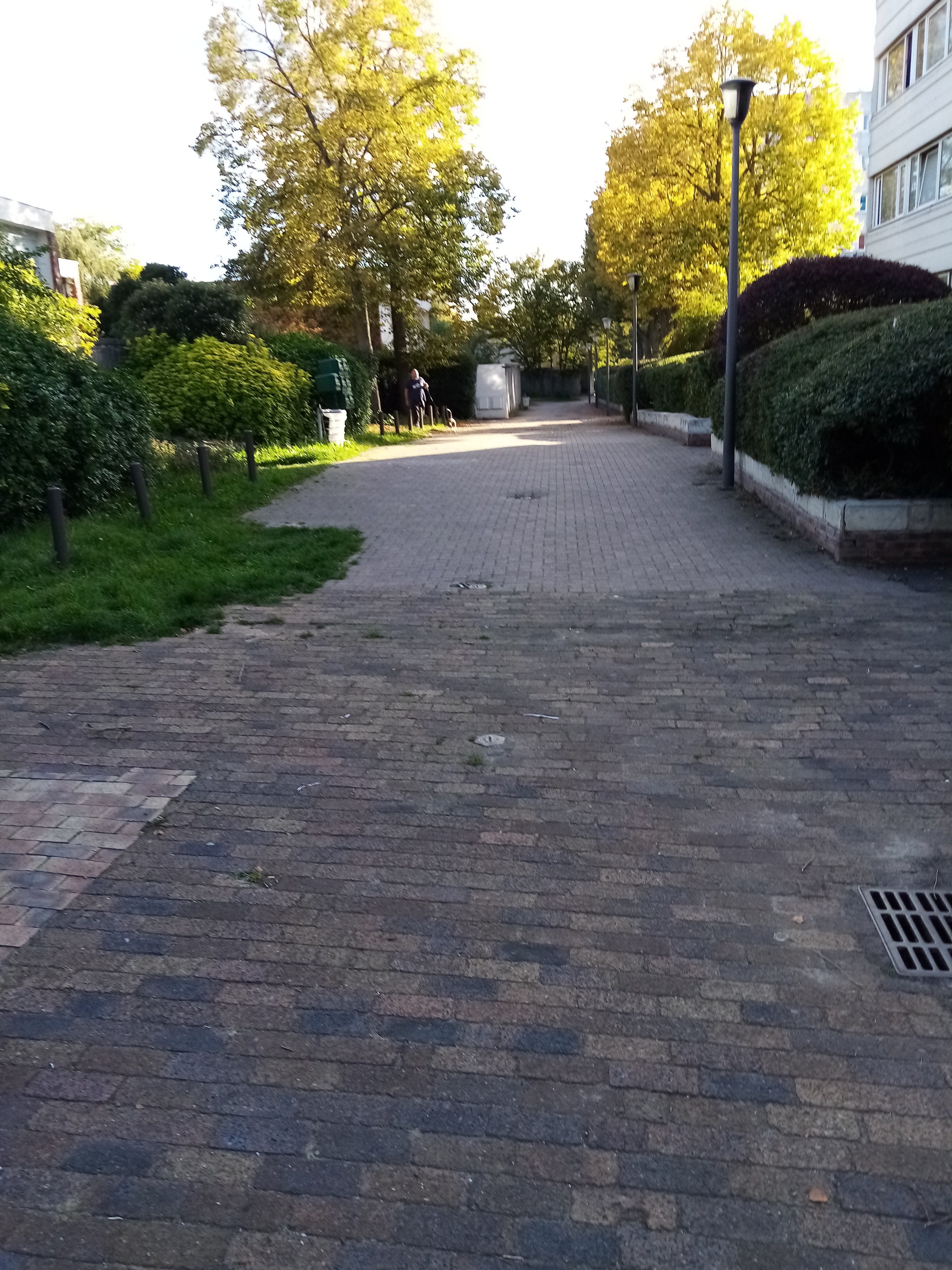 Il en résulte un espace à deux étages dominés pour celui qui est inférieur par le bruit, la vitesse, les trajectoires et les odeurs de combustion de carburants ; et pour le supérieur : par les échos de discussion entre passants ou de jeux d’enfants, la lenteur, les cheminements et des parfums de « nature ». Il est 18h00 passées, la fraicheur tombe, l’herbe des pelouses et les feuilles mortes commencent à dégager les parfums qui vont avec cette fraicheur.
