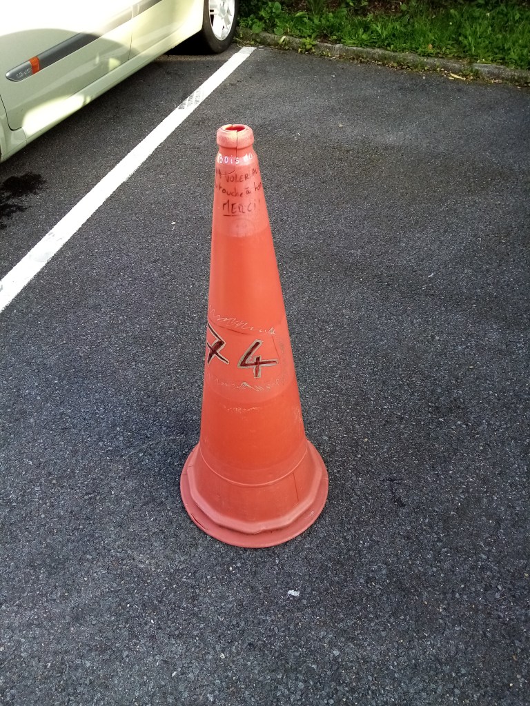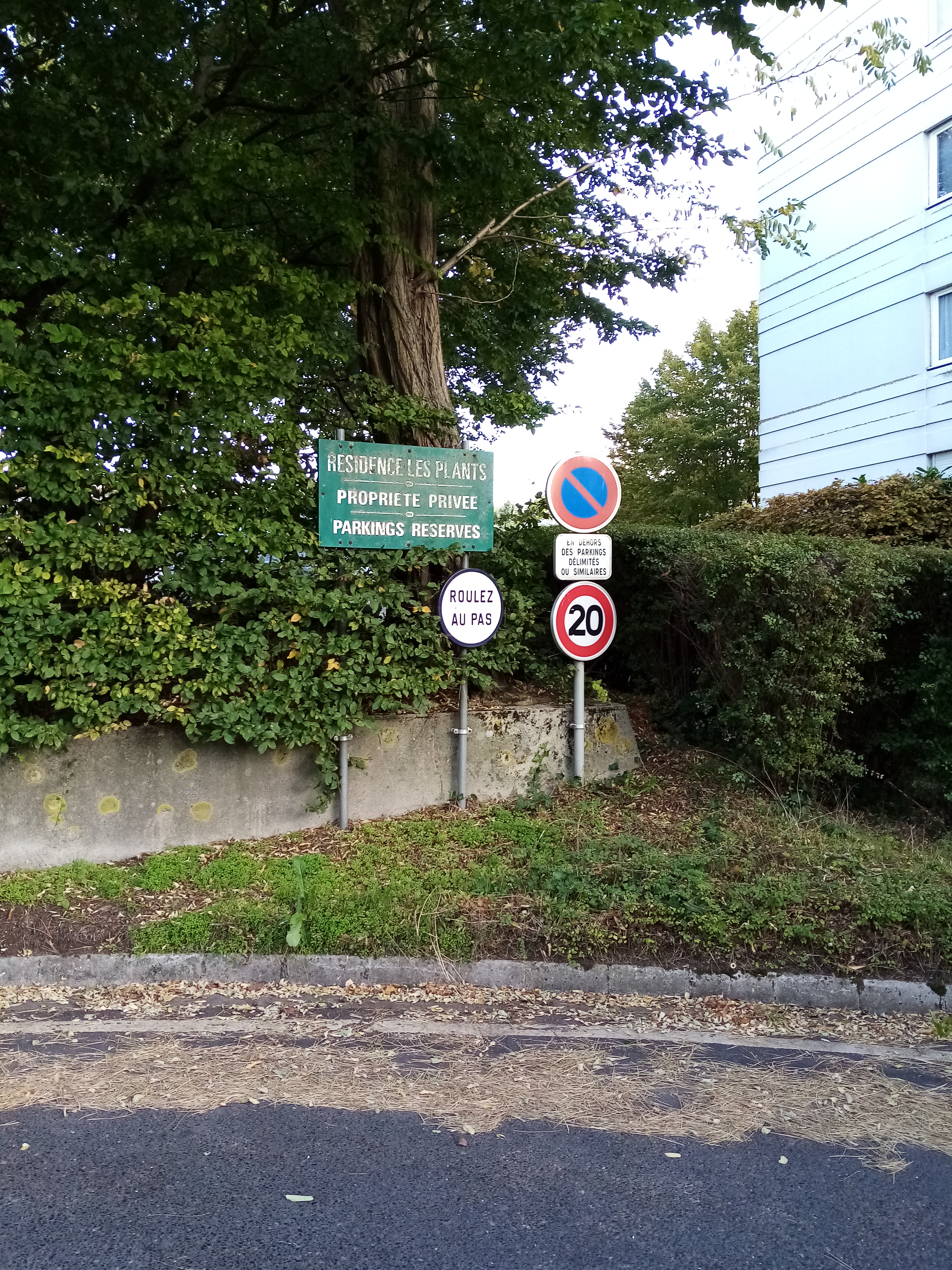 Zones de friction car il faut bien que les automobilistes résidents viennent garer leurs voitures près des immeubles ou des maisons sur les parkings semi-circulaires qui les bordent. Les places sont rares, numérotées et des plots viennent « protéger » ces places. Des passages sont aussi ménagés pour les résidents piétons au moyen de petits objets fixés au sol condamnant des places de parking pour assurer les continuités de cheminement. Un grand nombre d’objets signalétiques, panneaux ou autres, rappellent les nécessités d’un partage de l’espace entre les différents types de mobilité.