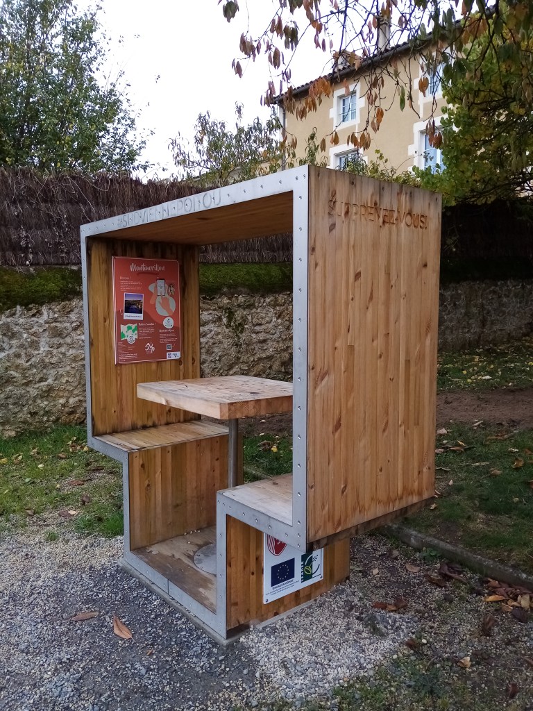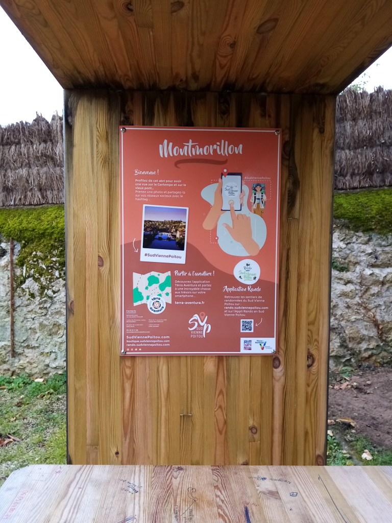 Une affiche nous dit sa fonction prescrite : encourager à prendre des photographies depuis cet emplacement ou en s’en décalant un peu et diffuser ces photographies via une application mise en place par l’Office de tourisme du Sud Vienne Poitou. Un QR-code conduit vers d’autres applications invitant à entamer ou poursuivre la découverte de cet espace aux confins de la Vienne et de la Haute-Vienne.