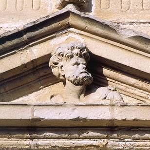 Un buste d’homme semble sortir du fronton triangulaire à gauche de la niche dévolue à une statue équestre du constructeur de ce château, Jacques Galiot de Genouillac.