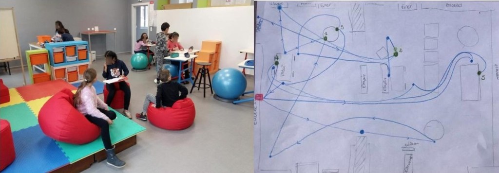 La présentation de Bérengère Kolly commence avec une anecdote narrée par Liliane, professeure des écoles auprès de laquelle elle conduit un travail ethnographique depuis plusieurs années (travail ethnographique). Des enfants prennent l’initiative un jour de discuter l’organisation de l’espace de la classe et de la modifier (tables agencées en un long alignement dégageant ainsi une large étendue disponible au sol). Cette organisation dure environ dix jours avant que de nouvelles modifications ne soient apportées.