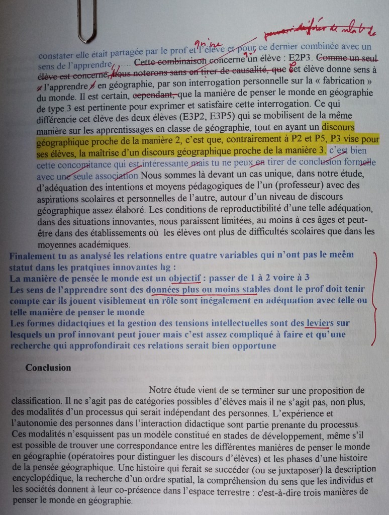 En noir, ce que j’ai écrit, en bleu les remarques de Jacky. En rouge, des griffonnages de ma main qui annoncent les corrections à venir. C’est le futur chapitre 9 de la partie III de L’innovation en histoire-géographie : « Rapport géographique au monde et innovation en classe de géographie ».