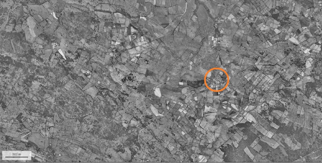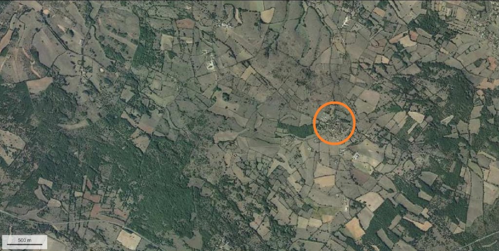 Autour de ce bourg, des terres agro-pastorales d’un élevage à dominante ovine : elles couvrent le môle calcaire sur lequel est situé le village. Elles sont desservies par un réseau en étoile de petites routes, que complètent des chemins bordés de murs de pierre (voir extrait de carte IGN actuelle)