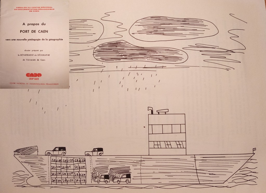 On trouvera ci-dessous la reproduction de la couverture de la brochure éditée en 1976 par le CRDP de Caen : A propos du port de Caen. Vers une nouvelle pédagogie de la Géographie. Compte-rendu des travaux réalisés en 1976 par les participants à la valeur Géographie et pédagogie. Ce compte-rendu a été rédigé par Francine Best avec la collaboration des enseignants : Armand Frémont, Gérard Houzard et Anne Le Roux. Ainsi qu’un des dessins d’élèves reproduits dans cette brochure. L’expérience conduite dans cet enseignement universitaire associait les étudiants, des élèves de 6e et de 2nde et leurs professeurs.