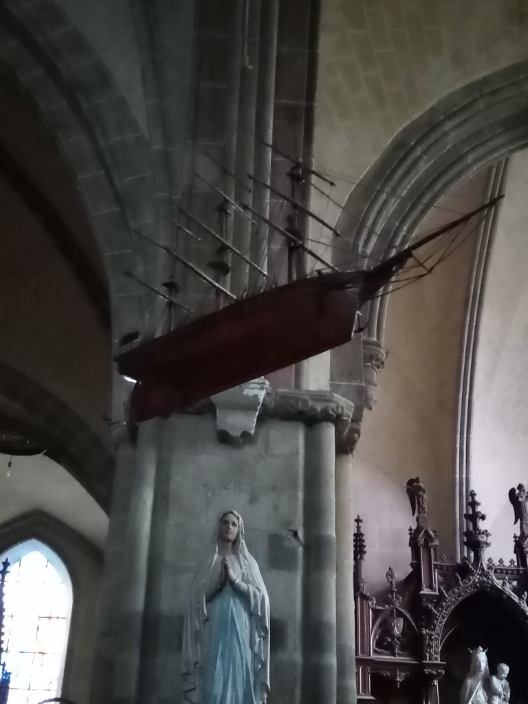 Non loin, suspendu, un ex-voto représente la goélette à trois-mâts barque, la « Rosalie », immatriculée à Saint-Malo et datant du milieu du XIXe siècle.