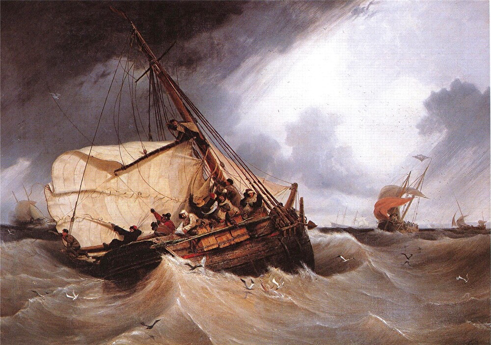 De l’éprouvante vie des paysans-pêcheurs à bord (« Pêche ou crève »), peu de traces tangibles. La peinture peine à évoquer les cadences, l’humidité et le froid, le risque de naufrage. Voici cependant « La pêche à la morue sur le banc de Terre-Neuve » peinte en 1832 par Louis Garneray (1783-1857) corsaire avec Surcouf, puis peintre et finalement directeur de musée.