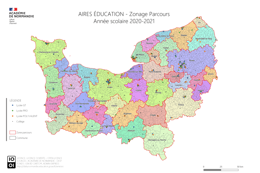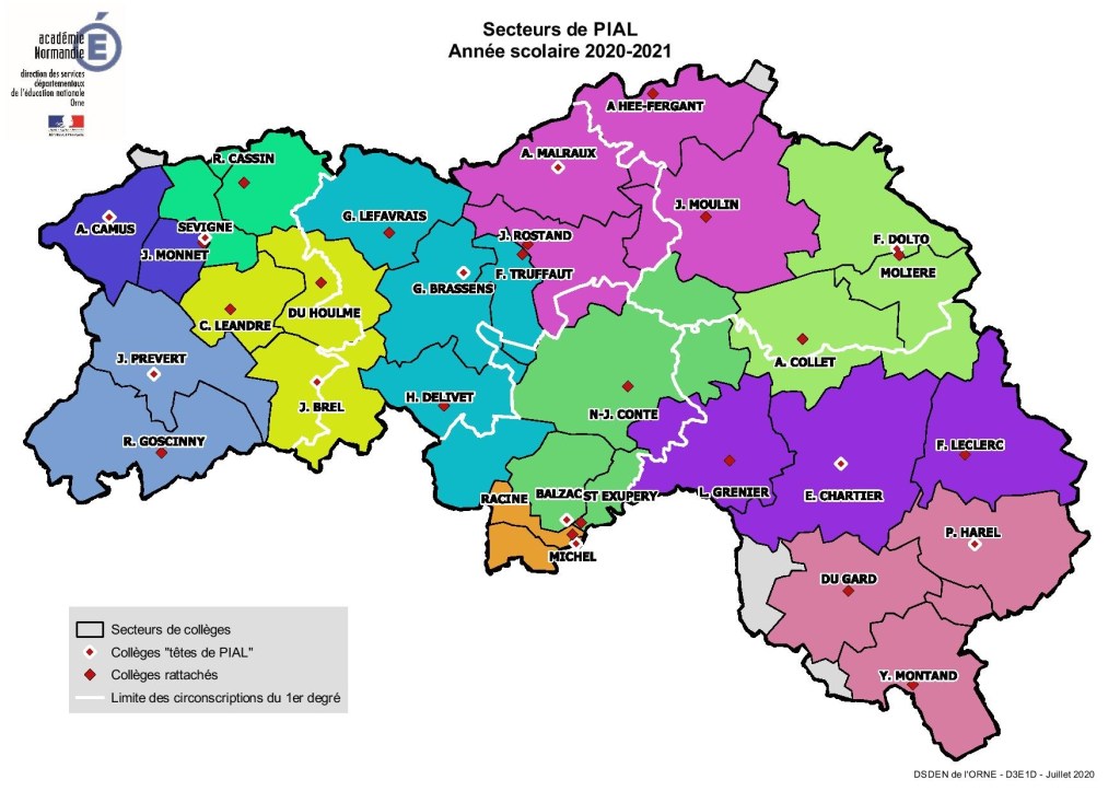 Pour constituer cette base, il faut aller à la recherche d’informations sur des initiatives locales, des réseaux en cours de constitution (exemple du Projet éducatif social local de la Manche). Il faut aussi prendre en compte les zonages territoriaux dont ceux de l’Education nationale qui s’avèrent d’une grande diversité. Wandrille Hucy montre cette complexité territoriale institutionnelle avec la carte des « AIRES Education : zonage parcours » et celle des PIAL : Pôles inclusifs d’accompagnement localisés (voir ci-dessous celle de l’Orne non coïncidant avec le maillage des circonscriptions premier degré). On comprend ainsi qu’il y a des raisons structurelles à ce que les personnes oeuvrant à l’inclusion ou pouvant bénéficier de dispositifs communiquent peu. La base de données a donc une ambition de géolocalisation en direction des acteurs, pour savoir où aller pour quels besoins ?