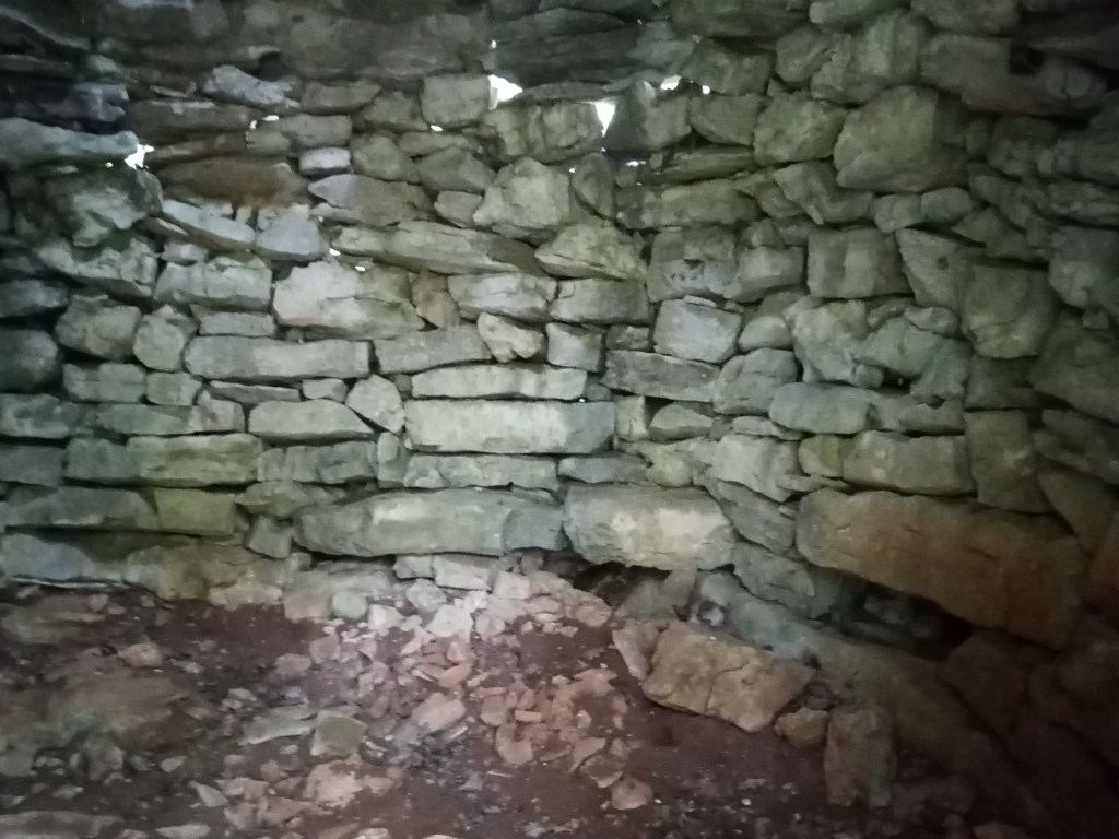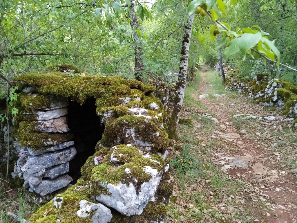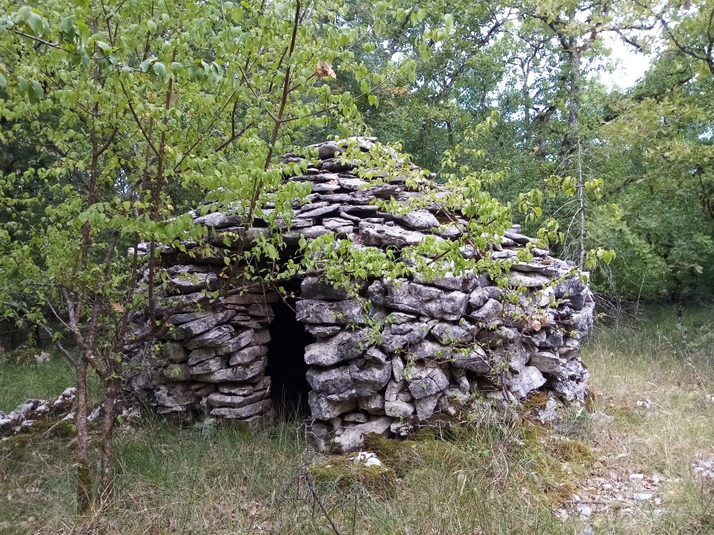 - une gariotte à la couverture en partie effondrée, comme deux autres vues également dans notre parcours. Les pierres plates mais épaisses qui forment leur toit finissent par glisser ou s’entraîner mutuellement dans leur chute.
