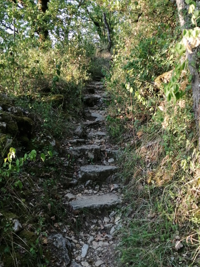 Perception 1. Le sentier depuis le bas du vallon de Lunan est abrupt. Dans un virage à angle droit, il est même taillé dans le calcaire, des deux côtés, sur plus d’un mètre de haut. Pour être praticable, des marches ont été ébauchées dans la roche [photo 3]. Et il a été pratiqué : les marches sont usées, la pierre lustrée par les sabots des humains, des moutons et des vaches. En travers du chemin, un pan de roche oblique d’environ un mètre-cinquante. Ce rocher lisse et penché a été taillé en escalier, seul moyen de le franchir en temps de pluie [photo 7]. Forme d’écriture terrestre. Plus jamais cette roche ne sera ce qu’elle avait été, pan de calcaire à demi-redressé sous une falaise dominant le versant d’un méandre du Lot. Des humains y ont creusé, inscrit ces quelques marches nécessaires à la sécurité de leurs déplacements. D’un village à l’autre, d’une maison (en haut ou en bas) à un jardin ou à une pâture. J’ai pensé comme souvent devant la trace présente d’un travail passé, au travail lui-même. Qui ? Combien de temps ? Avec quels outils ? Quels mots pour accompagner le geste ? Comment résonnait cette langue ? Ecriture aussi en pas accomplis (des milliers) sur ce morceau de chemin et les terres et villages qu’il reliait, si on en dessinait les tracés à même la terre. Mais l’usure des marches est une écriture de cette sorte. Elles et ils allaient d’où à où ? Franchissaient-ils le Lot quelquefois ? C’était avant le pont de chemin de fer et le pont routier en contrebas. De toute façon, il fallait pour travailler, aller par les chemins tracés sur le causse, dans la vallée et entre les deux.