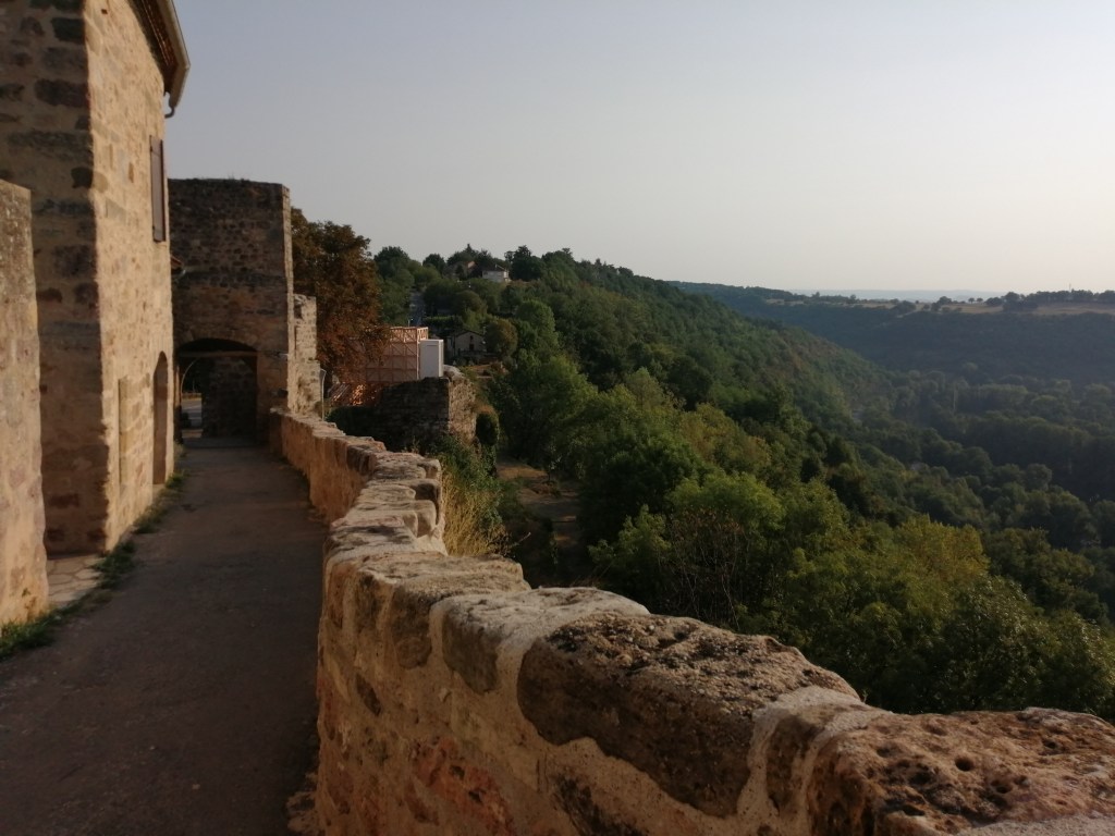Perception 2. Peu de temps après l’apparition de l’escalier taillé dans la roche. Nous arrivons sur le rebord de la falaise. Les horizons se sont élargis. La rivière Lot déjà chauffée – il n’est pourtant que neuf heures – produit une brume d’évaporation qui bleuit les versants [photo 8] En face nous avons les collines derrière Capdenac-Gare qui la séparent de la vallée de la Diège. Nous y sommes passés lors d’une promenade n°1 dans le Capdenacois [photos 9 et 10]. Et sur le côté, ce sont cette fois-ci les hauteurs du Causse de Villeneuve que nous avons découvert lors d’une promenade n°2 dans le Capdenacois à partir de Saint-Julien d’Empare [photos 11 et 12]. Cette fois-ci, c’est l’émotion de l’inter-promenades : interspatialité (?) nous sommes-nous dits. En tout cas pas seulement inter-visibilité, car il s’agit de se savoir dans les horizons de nos autres promenades comme elles sont ce matin dans les horizons que nous parcourons des yeux. Ce n’est plus un chemin, c’est un entrelacs de routes vues, de chemins parcourus rappelés à la mémoire et de sentes qui resteront souvent inconnues. En bas, cette virgule de lumière blanche produite par le soleil tamisé sur un train courbe indique le centre ancien (la gare) d’un bassin de vie à partir duquel nous rayonnons cet été en promenades [photo 13]. C’est la promenade n°3 [photo 4]. Se savoir de passage dans ces paysages qui eux-aussi passent, même si ce n’est pas au même rythme et si les topographies ne bougent pas.