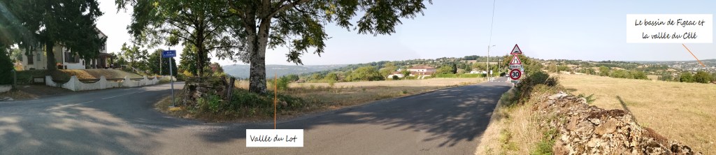 La balade de Lunan suit un parcours qui va du bourg [photo 1] à l’église Saint-Martin de Lunan, presque seule en contrebas, dans un vallon qui conduit jusqu’à la vallée du Lot [photo 2]. De là, un étroit chemin mène sur les rebords du plateau de Capdenac-le-Haut [photo 3]. Une fois hissés sur ce plateau, nous suivons le bord de la falaise jusqu’au vieux bourg de Capdenac-le-Haut [photo 4]. Exercice d’admiration depuis le banc installé face à Capdenac-Gare [photo 5]. Et retour vers Lunan en passant par des hauts (hélas coupés par une petite route fort empruntée – la route dite de la Carte de France) d’où l’on aperçoit en tournant juste la tête, d’un côté la vallée du Lot, de l’autre celle du Célé et Figeac (sa partie Est et en hauteur) [photo 6].