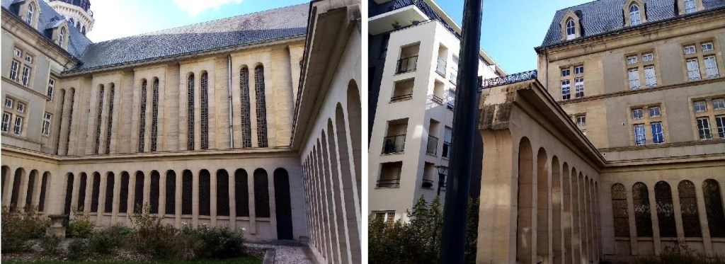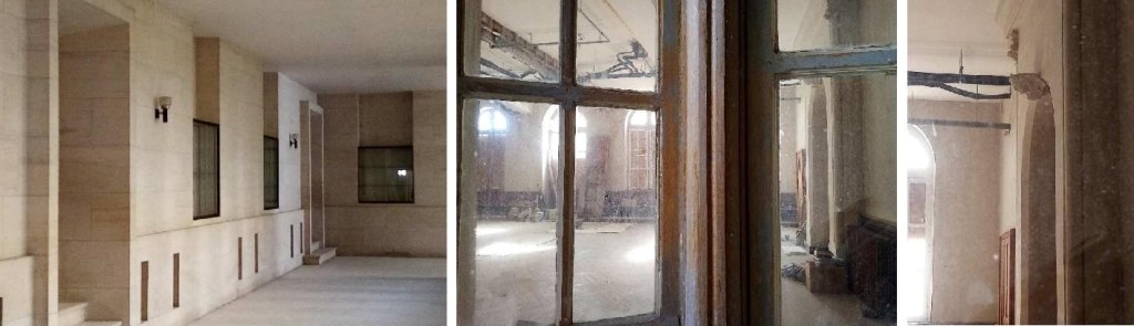 Une fois à l’intérieur, on peut apercevoir la médiocre qualité des « sutures » qui relient la nouvelle chapelle elle-même encastrée dans les bâtiments du XIX e siècle aux immeubles d’habitation construits par Eiffage. La découpe du cloître en son angle nord-ouest est d’une grossièreté remarquable (voir photographies ci-dessus). La déambulation dans la partie accessible du cloître, le long de la chapelle, permet aussi de voir l’inachèvement des travaux, dans ce qui était l’ancienne salle commune des sœurs du Bon Sauveur (voir ci-dessous).