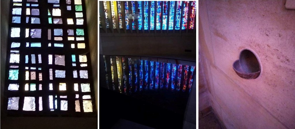 Et il y a la géographie de la chapelle elle-même qui domine pendant cette visite ; une géographie du sensible. Elle forme un vaste espace intérieur dépouillé, silencieux, baigné dans une lumière qui change au fur et à mesure de la visite, avec deux tonalités : l’une rosée produite par le mélange des bleus et des rouges qui dominent dans les pavés de verre des vitraux du cœur ; l’autre plus claire émise par les vitraux du transept et qui descend d’une sorte de loggia. Le mobilier (orgues, stalles, bénitiers, lustres en verre de Murano) reflète ou absorbe ces lumières douces (voir photographies ci-dessous).