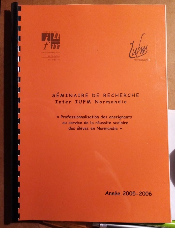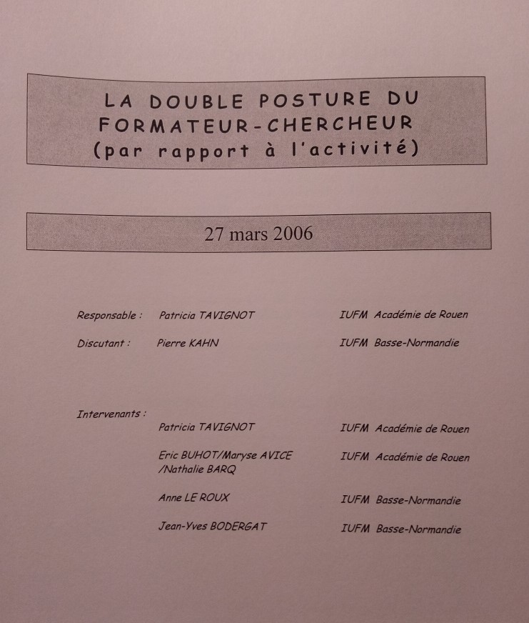 La première saison donne lieu à trois séminaires tenus le 30 mars 2004 à Rouen sur « le(s) sens de l’évaluation », le 10 mai à Caen sur « Enseignement-Motivation-Apprentissages » et le 24 juin à Rouen « Autour de la professionnalisation ». Le séminaire se prolongera jusqu’en 2011, mais aura entretemps donné lieu à la constitution du groupe de recherche. Les actes de ces séminaires sont diffusés en version papier au sein des deux instituts. Voir en photographie ci-dessous : la couverture d’un de ces actes et la page d’ouverture d’une des sessions portant sur un des sujets de prédilection de Patricia : la double posture du formateur-chercheur.