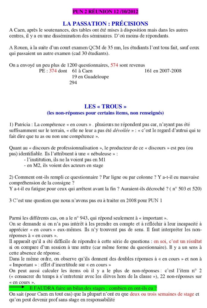 Les séances d’analyse/interprétation de graphes issues des ASI réalisées par Marc (Bailleul) ont été et sont restées pour moi des modèles de travail collectif rarement égalés. En voici une trace ci-dessous, issue d’un des compte-rendu de réunions. Cette réunion se tient le 12 octobre 2012 à Caen. Jean-Yves (Bodergat) a assuré ce C-R avec verbatim. C’est le début de la réunion consacrée à la passation de la deuxième enquête passée au mois de juin précédent. Première page. Premières interrogations. Une intervention de Patricia : on entend sa voix…