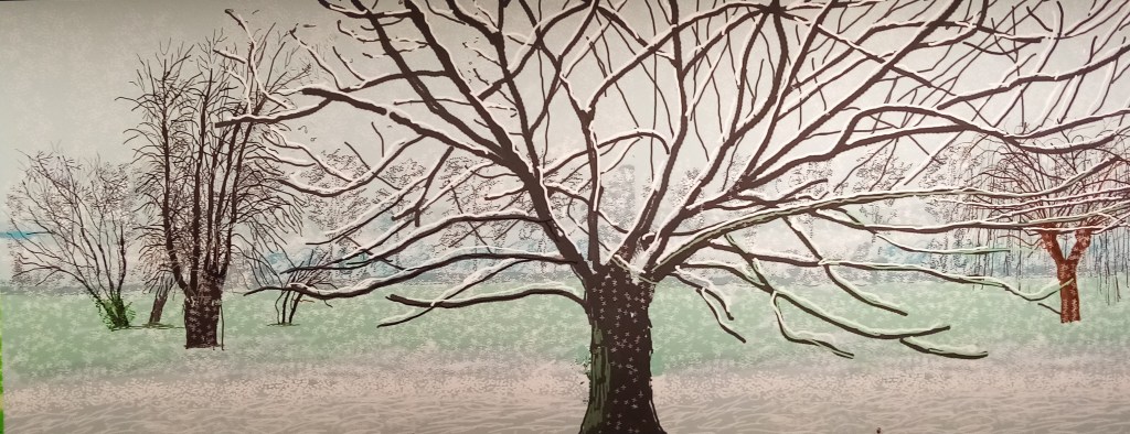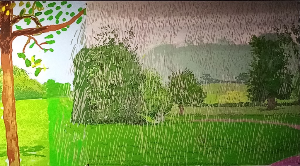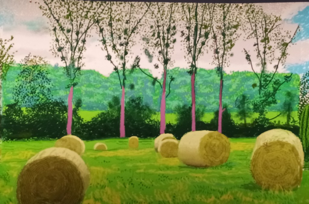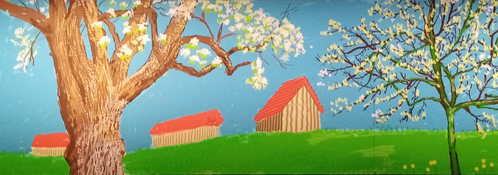 Comme certaines œuvres précédentes de Hockney (ses montages photographiques, ses vues du Grand Canyon), A Year in Normandy est une expérience visuelle et corporelle. Il faut passer devant elle pour que l’œuvre s’anime et restitue cette expérience des saisons qui passent…