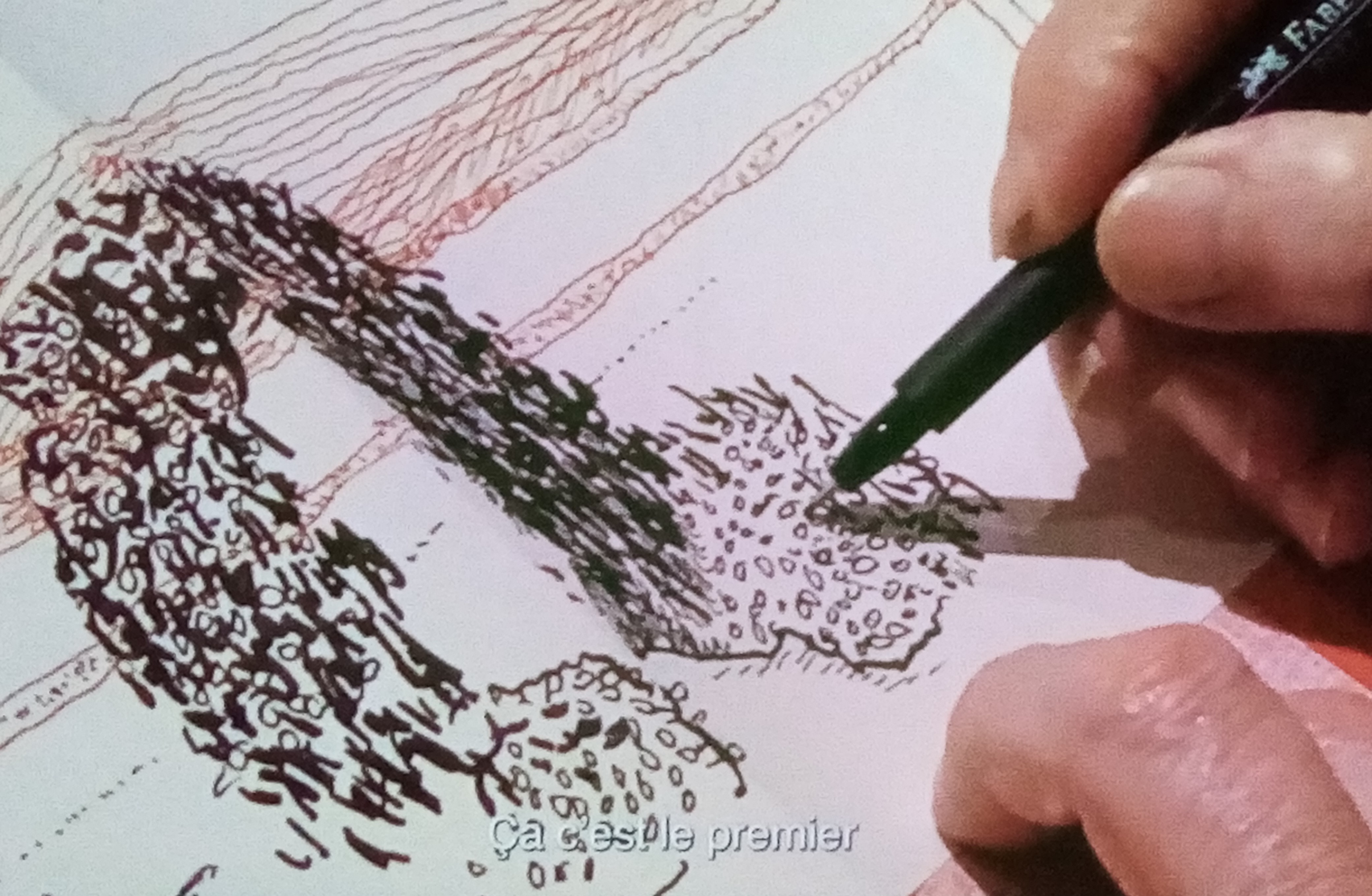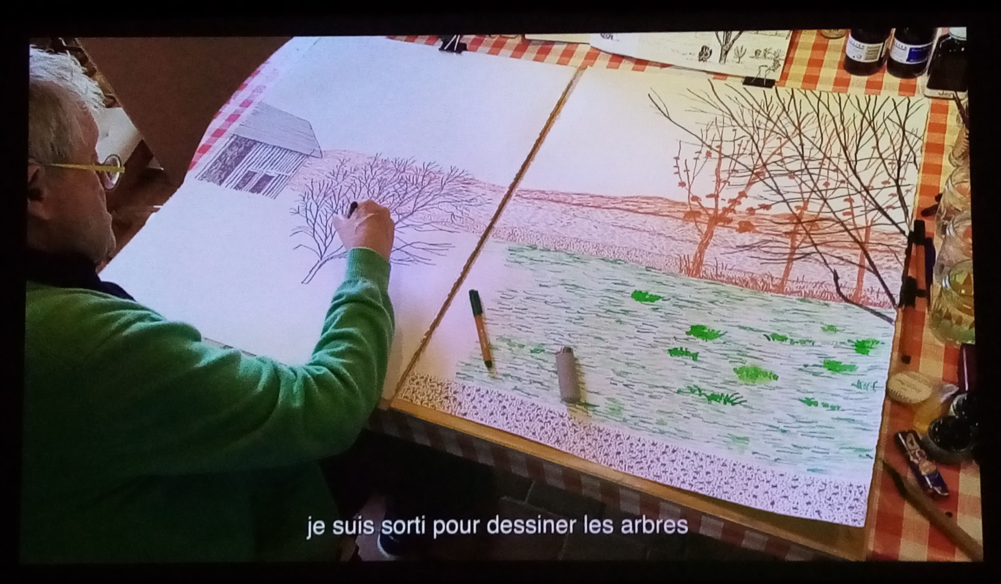 Installé quelques mois avant la pandémie dans une demeure du Pays d’Auge, David Hockney va y rester plus longtemps que prévu. Il y dessine depuis la cour de son manoir, puis se déplace dans les environs pour finalement produire quelques 220 dessins. Dessin sur papier, assemblage de ces dessins, réalisations à la tablette graphique et montage final : un film d’une quinzaine de minutes présente la genèse de cette œuvre originale.