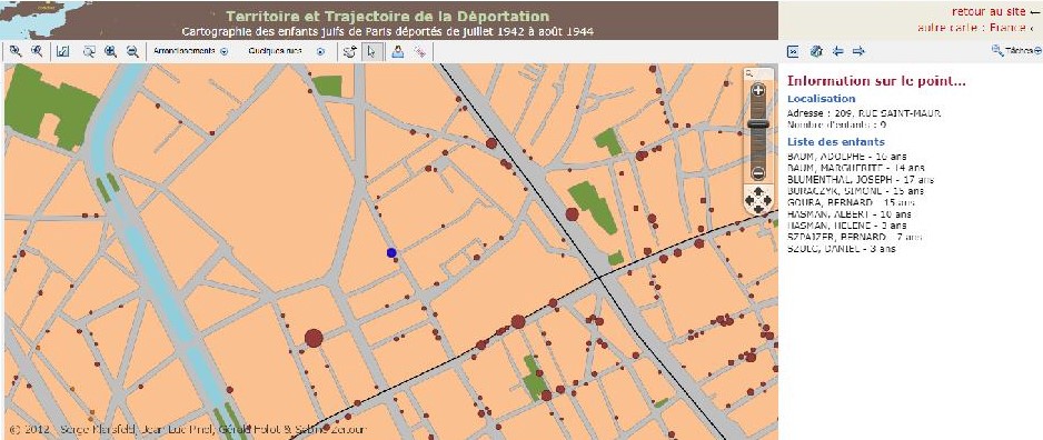 le site de la « Cartographie des enfants juifs de Paris déportés de juillet 1942 à août 1944 » (Données de Serge Klarsfeld sur la déportation des enfants juifs de Paris – nom, prénom, âge, adresse – Points adresses et fichier des équipements actuels de Paris , Atelier parisien d’urbanisme (APUR), plan des îlots de Paris en 1954, Jean-Luc Pinol). Lien : http://tetrade.huma-num.fr/Tetrademap_Enfant_Paris/