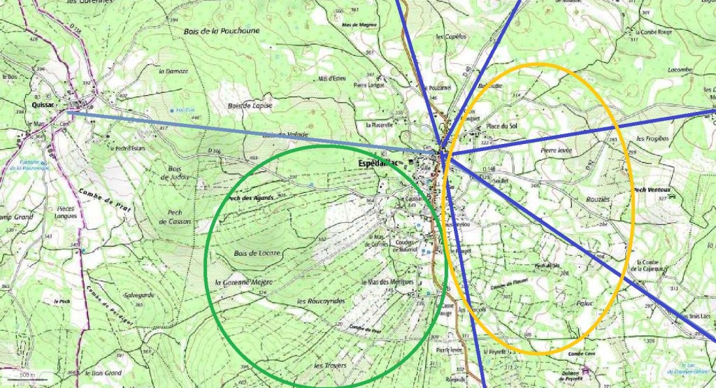 Contrairement à Lunegarde, Espédaillac n’est pas sur un point culminant. De son axe central qui perd doucement en altitude du Nord vers le Sud, on ne peut pas avoir de vue sur la zone boisée qui domine le village. Mais vers l’Est, l’horizon est dégagé jusqu’aux bords du causse de Gramat, au Limargue et au Ségala (voir photographies ci-dessous).