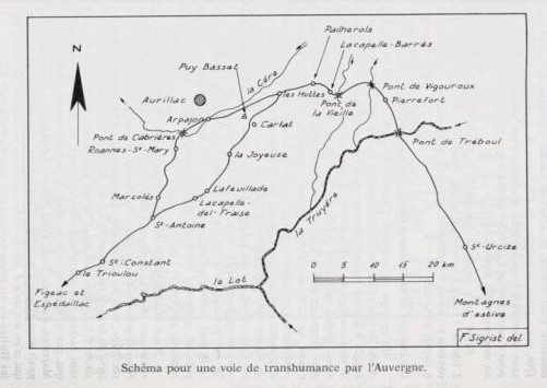 Les bergers viennent pour partie avec le troupeau, d’autres sont Auvergnats et rendus disponibles en même temps que les terres de montagne louées par Lacaze. On peut aujourd’hui essayer d’imaginer ces troupeaux passant par les pentes du Ligoussou pour rejoindre la vallée du Célé, puis Figeac, Bagnac avant de monter vers Arpageon-sur-Cère puis l’Aubrac (voir ci-dessous la carte réalisée par le même auteur).
