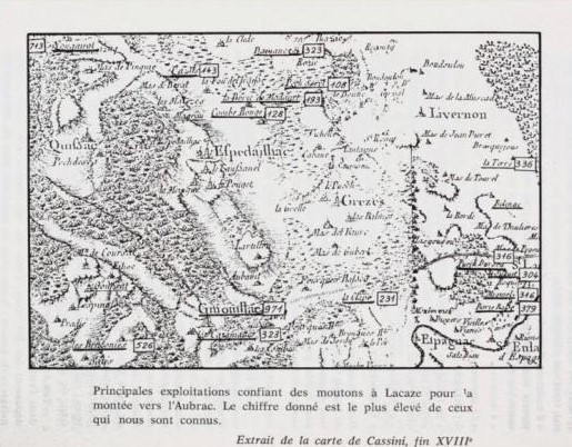 Cette orientation est aussi celle des transhumances ovines vers l’Aubrac au XVIIIe et XIXe siècle. On peut essayer de se les imaginer à partir des recherches de Gilbert Foucaud (1986). A Espédaillac, au début du XVIIIe siècle, œuvre un « entrepreneur de transhumance », Charles Lacaze (1683-1713), résidant à Ginouillac. Il rassemble jusqu’à 5153 bêtes venues de terres situées au Sud du bourg d’Espedaillac (dont Ginouillac), au Nord (dont Combe Rouge) et plus à l’Est, sur les pentes Sud du Mont Ligoussou. Gilbert Foucaud a représenté leur provenance sur la carte ci-dessous.