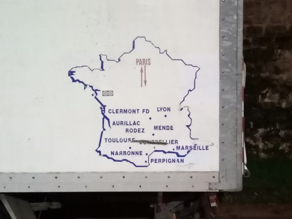 Un petit camion sans âge. Plutôt apprêté pour le déménagement. Blanc. Pas de nom d’entreprise, mais un logo sur l’avant de la remorque, après la cabine de conduite. Une silhouette du territoire français sur fond bleu et ocre (ciel et terre) strié par des lignes blanches, comme un soleil qui se lève… l’avenir. Et vers l’arrière de la remorque, toujours sur le côté, une autre découpe du territoire français avec à l’intérieur les localisations et les noms de Paris et de villes de la moitié sud du pays.